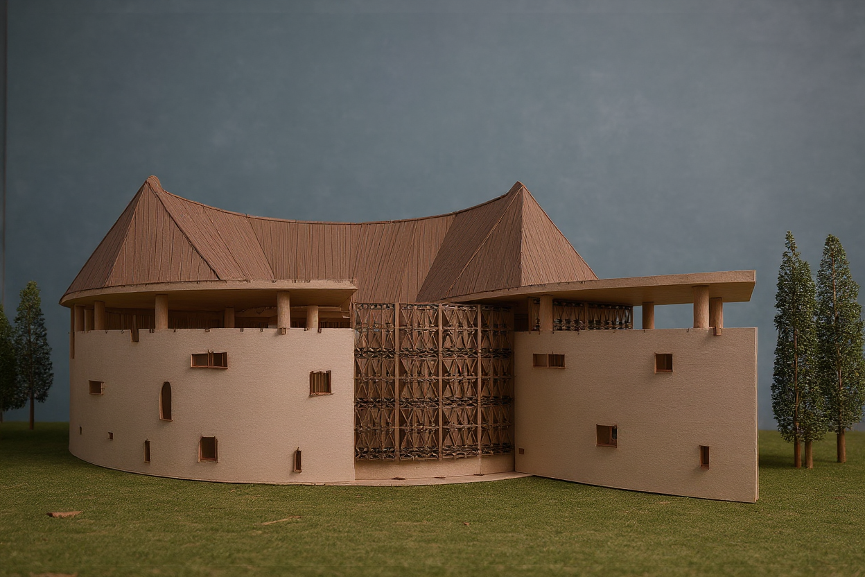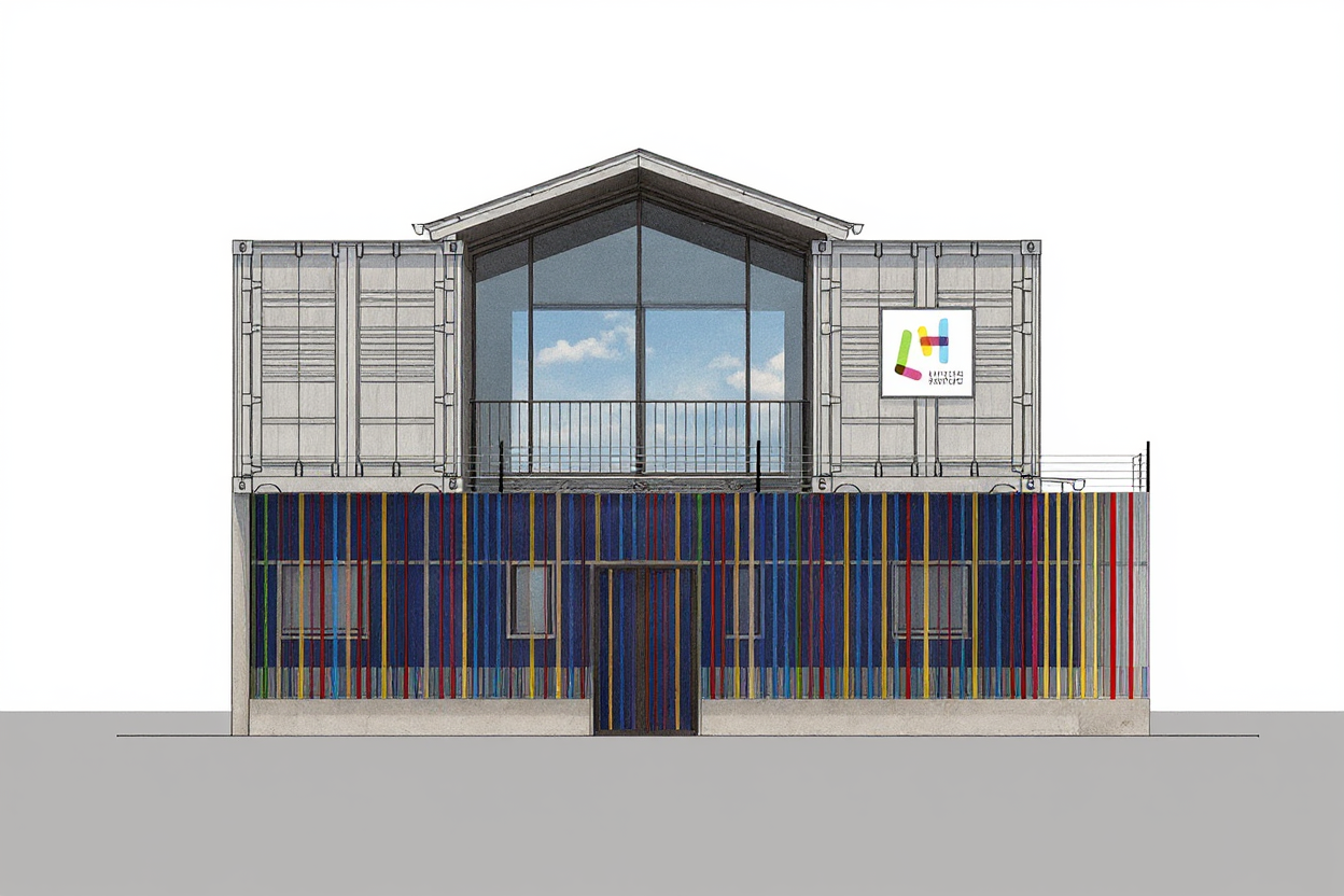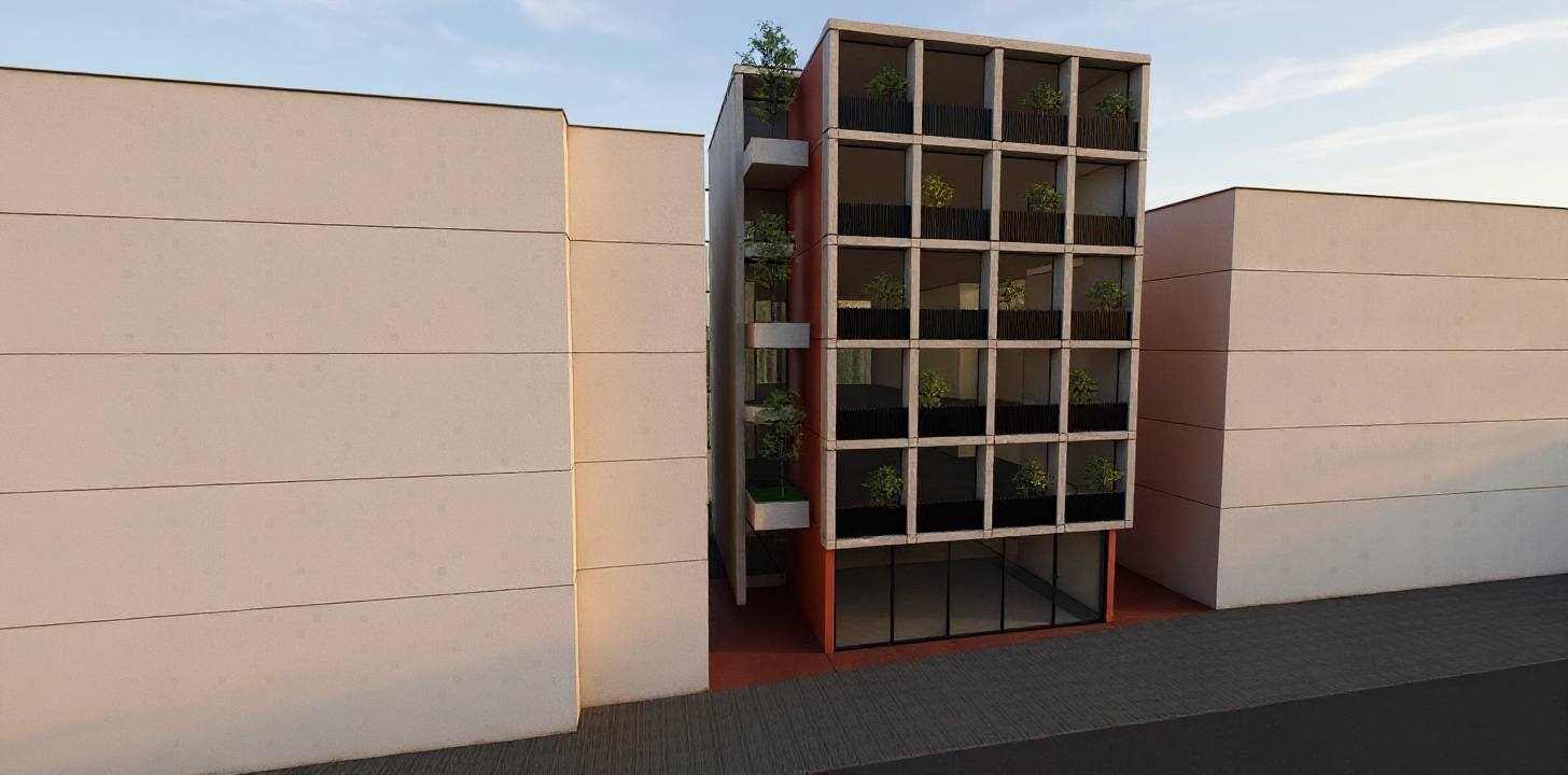 keep the current render exactly as it is do not modify any colors materials lighting geometry proportions or surrounding elements no global changes of any kind are allowed the only modification to apply is to the central space on the second floor which must be converted into a fully open void that passes completely through the building from front to back for this central second floor space there is no back wall no rear enclosure no glazing no glass no solid surface no depth closure no visual termination this space must render as a complete perforation through the building mass fully transparent all the way to the background with visible sky or distant neutral background through it with zero architectural elements inside the void