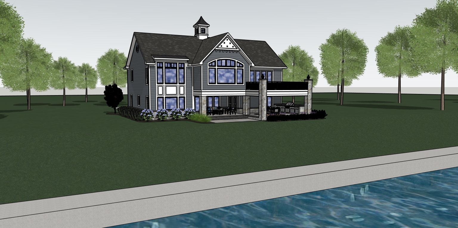 partly cloudy sky gray blue siding white windows add gutters and downspouts white railing