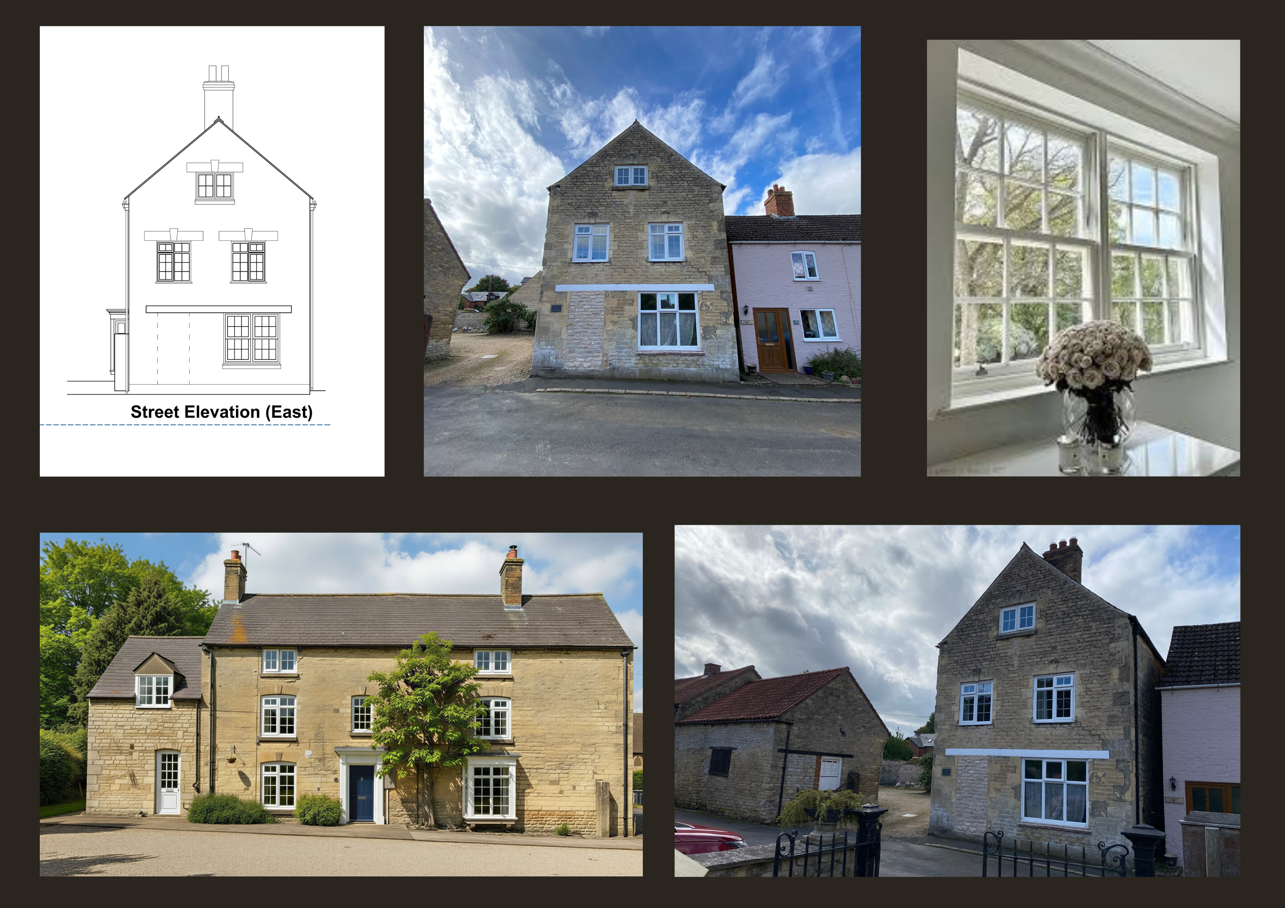 exterior shot keep the building windows and doors the same as the source drawing use the mood board for materials and landscape setting