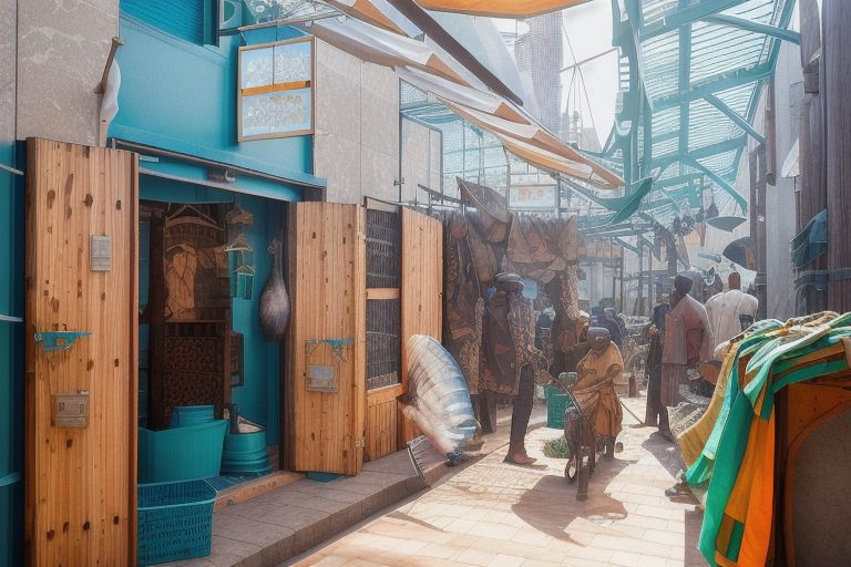 fish shops on street market wood and glass facade traditional canopy africa greneery architecture