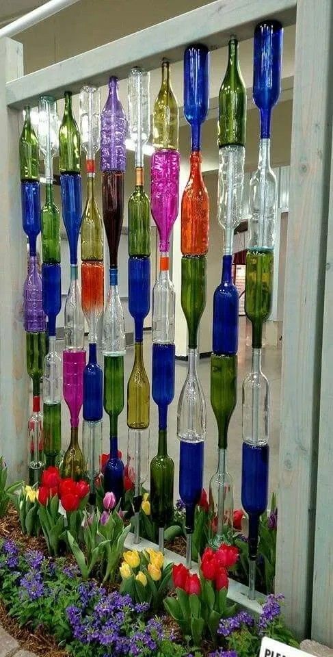 a divider of empty clear colorless coca cola bottles in alternating upside down and right side up pattern the floor is gray carpet the frame is black tubular steel