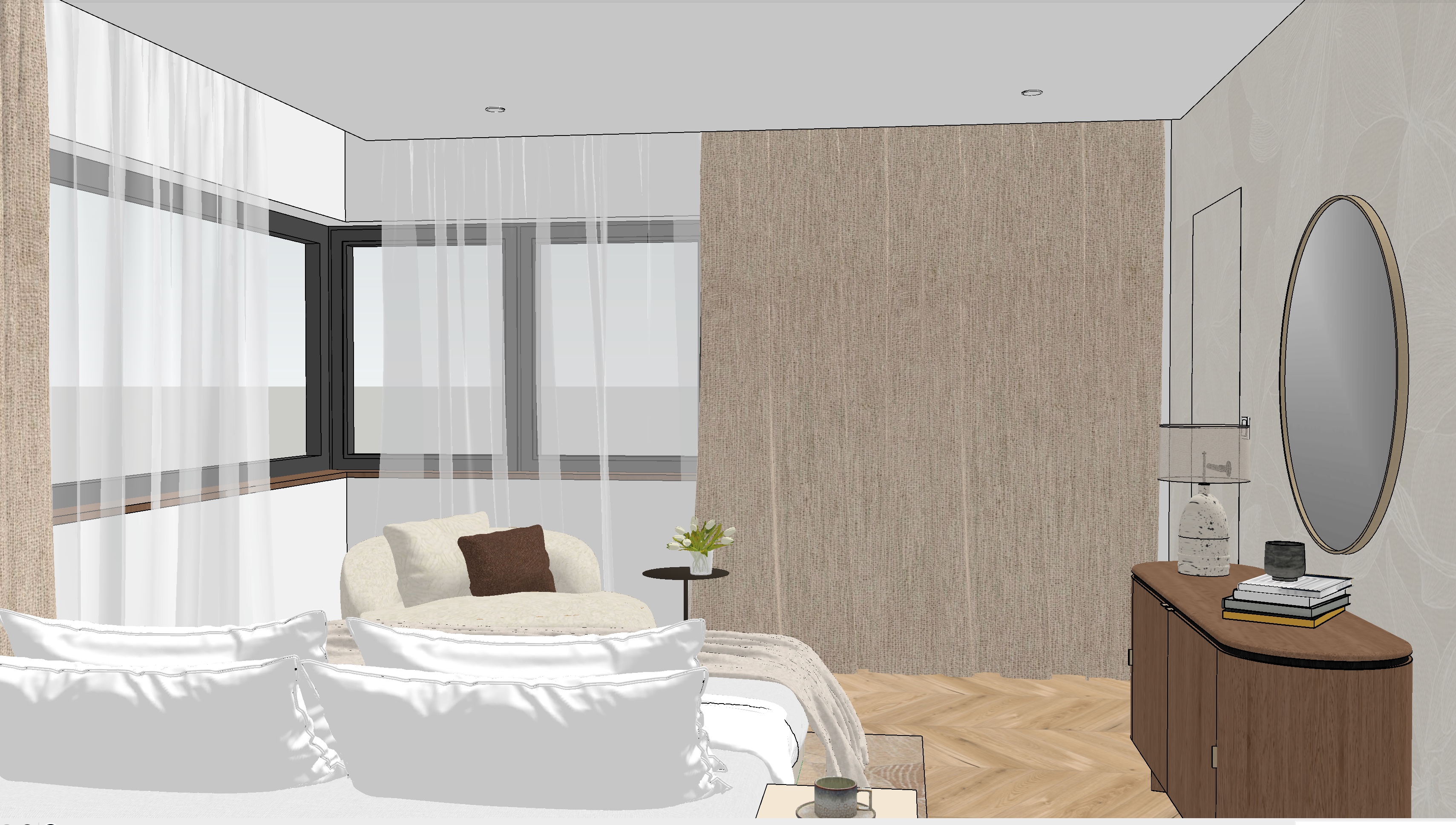 the same bedroom like previous rendering there is a round mirror non the right