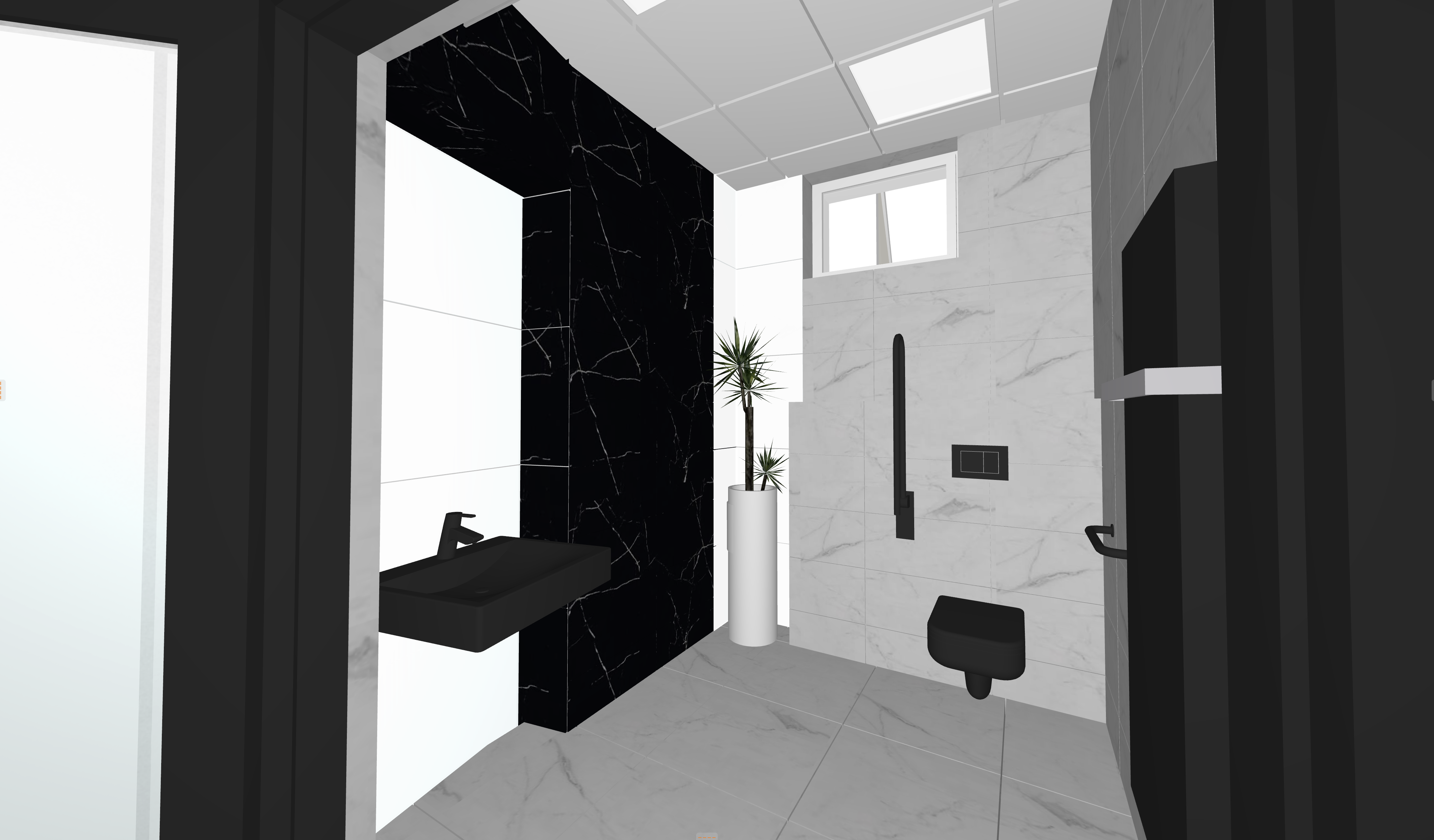interior from the top white and black stone on the walls make a vertical mirror behind the sink and a flower pot architecture