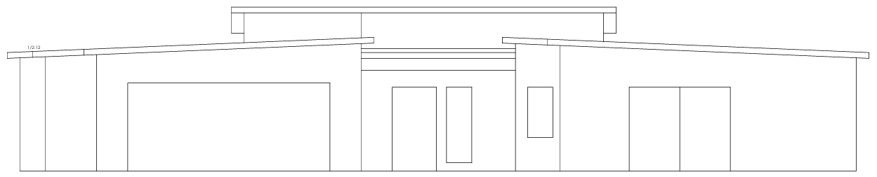 a modern single story house with a flat roofline and strong horizontal geometry the exterior is dominated by large floor to ceiling glass windows and sliding glass doors that create transparency and open views into the interior spaces the structure features clean minimalist lines with rectangular volumes connected together the central section of the house is slightly taller with clerestory windows running along the upper facade adding vertical emphasis while maintaining a sleek low profile on the left a bedroom space is visible with a bed and artwork framed by tall glass panels the middle portion showcases a living area with modern furnishings and a tall floor lamp visible through expansive glass to the right the dining and kitchen area are exposed with cabinetry a stove hood and pendant lights exterior materials appear to combine smooth panel siding with darker frames around the windows the house is set against a natural backdrop of trees shrubs and grasses blending contemporary architecture with the surrounding landscape the design should be rendered as a 2d architectural line sketch in black and white emphasizing the geometric forms window placements and strong modernist aesthetic omit shading focus on crisp lines and architectural detail
