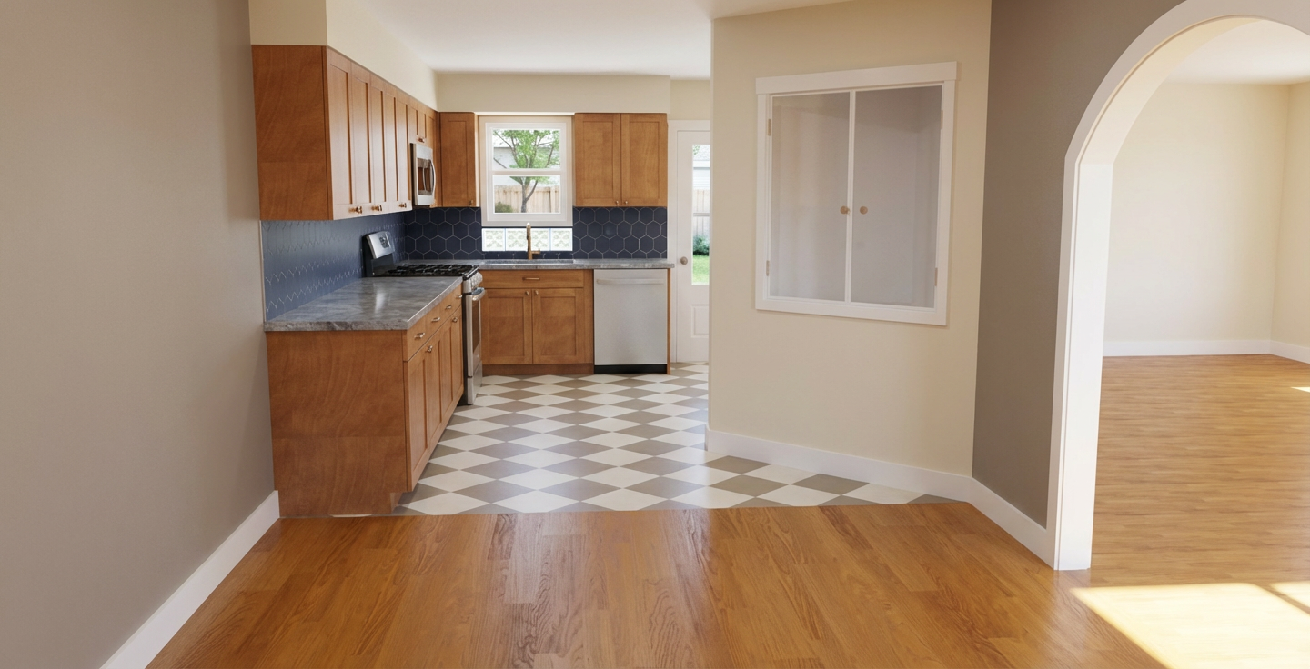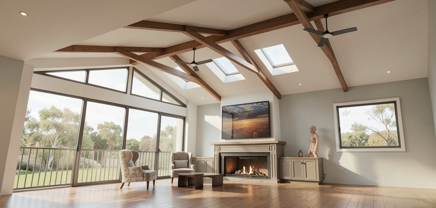 render the space in hyper realistic visualization quality at 8k resolution keep the room exactly as shown with all existing textures and materials unchanged the ceiling are wood the panels on the closet and the wall behind the bed is a colorful gradual gentle pastel paint from blue to pink to purple all as neutral as possible the overall image should feel realistic calm and natural with accurate lighting and material texture the rug should be a soft green mohair