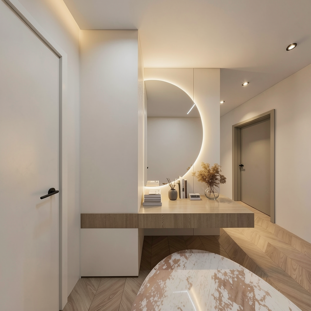fix the round rug on the floor and make it super realistic also the wooden floor make it realistic all the doors should be white