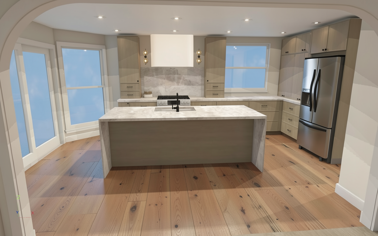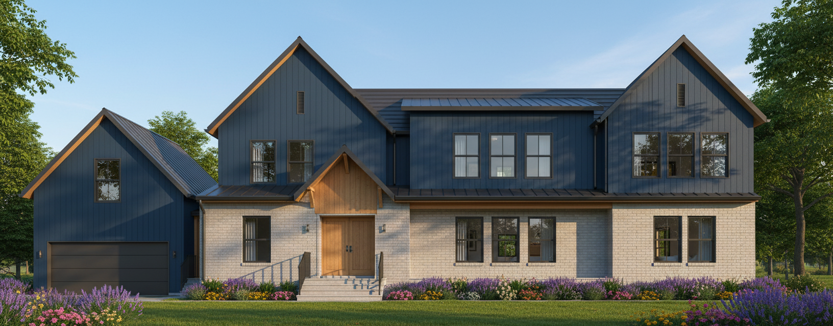 kengo kuma exterior shot render a charming modern farmhouse with a welcoming atmosphere the house features smartly designed color and material blocking using light brick dark blue hardie exterior paneling and wood panel accents large windows with dark gray roof the front porch has detailed railings and a warm wooden door the surrounding landscape includes lush green grass vibrant flower beds in shades of lavender pink and yellow and tall green trees that frame the property the sky is a clear blue with a soft golden glow from a setting sun casting gentle shadows on the house overall the scene should feel serene and inviting architecture