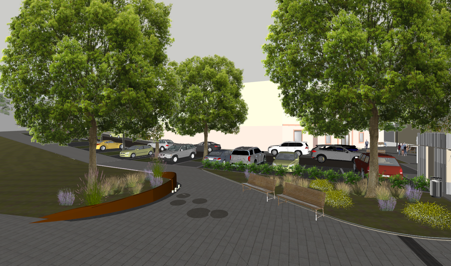 ultra realistic architectural visualization based strictly on the provided raw sketchup view preserve exact geometry proportions camera angle composition and architectural details do not redesign or alter the building enhance only with realism add realistic materials with physically accurate textures natural wood grain brushed concrete glass reflections subtle imperfections micro surface details use high dynamic range lighting with soft global illumination and realistic shadows create a lively atmosphere enhance environment with greenery slight wind in trees varied vegetation tones small urban details parked cars benches subtle signage add depth with atmospheric perspective and realistic sky conditions golden hour soft overcast choose whichever enhances the mood cinematic composition photorealistic rendering 8k detail realistic depth of field natural color grading slightly warm tones architectural photography style shot on full frame camera 35mm lens maintain realism over stylization avoid cartoonish or ai looking artifacts the round brown texture under the tree trunk is smooth round piece of corten