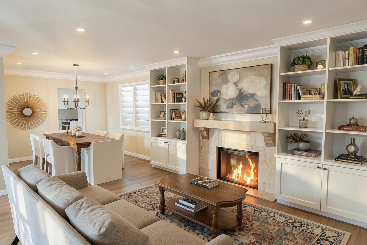 weathered cedar shingle siding white trim brown brackets dark grey roofing blue sky 6 foot white fence further in background new asphalt driveway width of door no houses in background add shrubs along fence in background