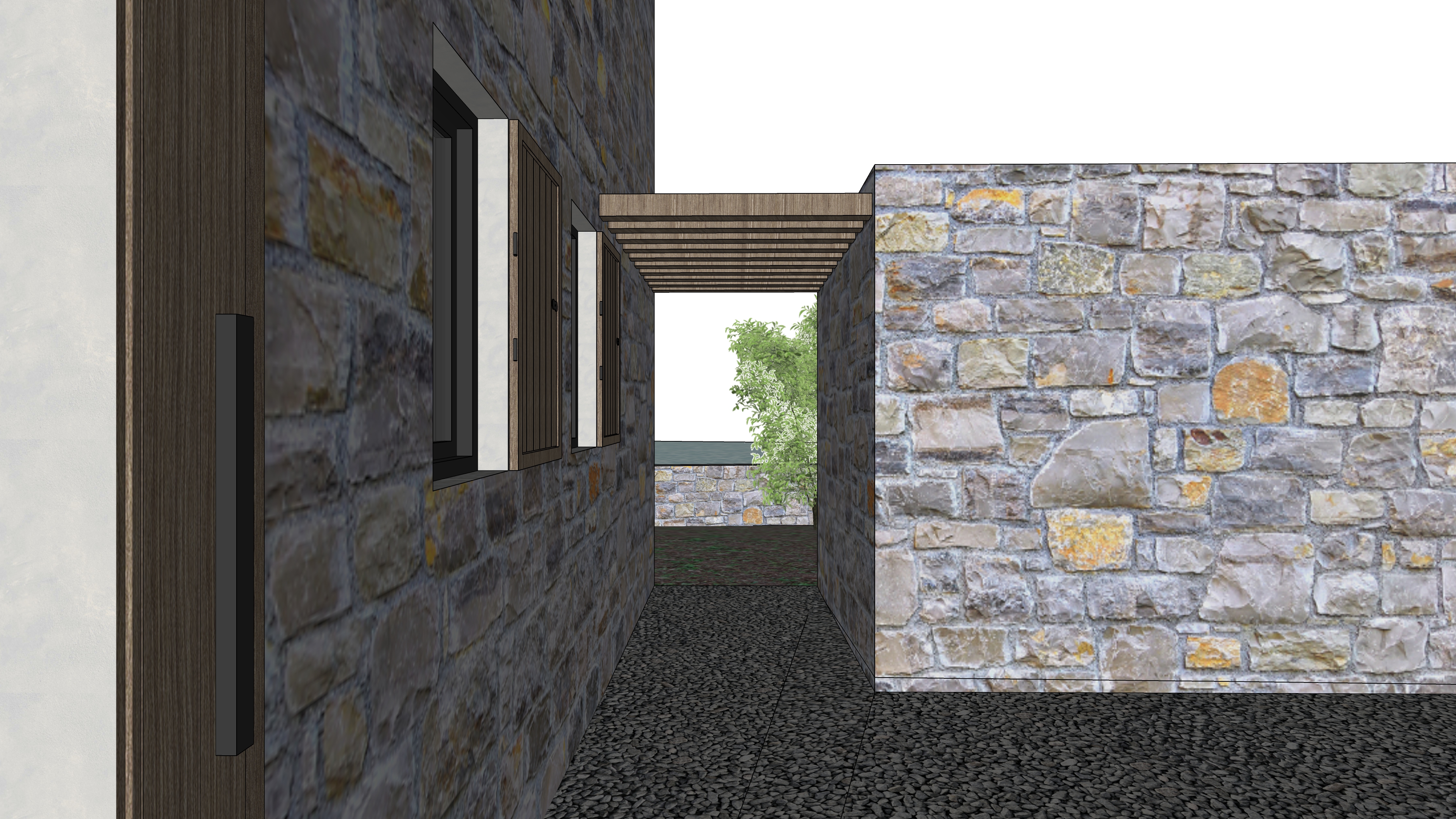 main prompt this is a house in thassos island by the sea the 2 storey volume is made of grey stone the window frames are dark grey and the shutters are medium oak wood negative prompt do not change materials do not change geometry