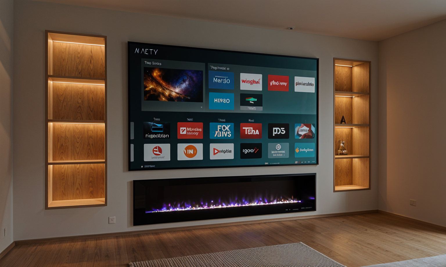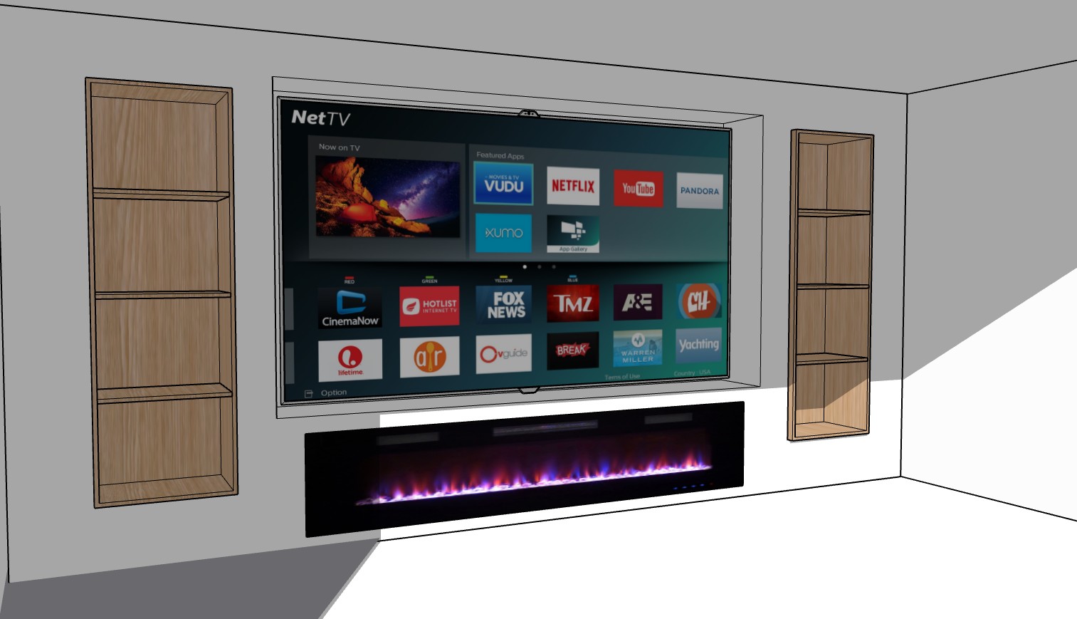 modernist wide angle shot create a 3d render of this tv media wall add led strip lights to the shelves make the room lighter soft ambience tv hangs inside unit architecture