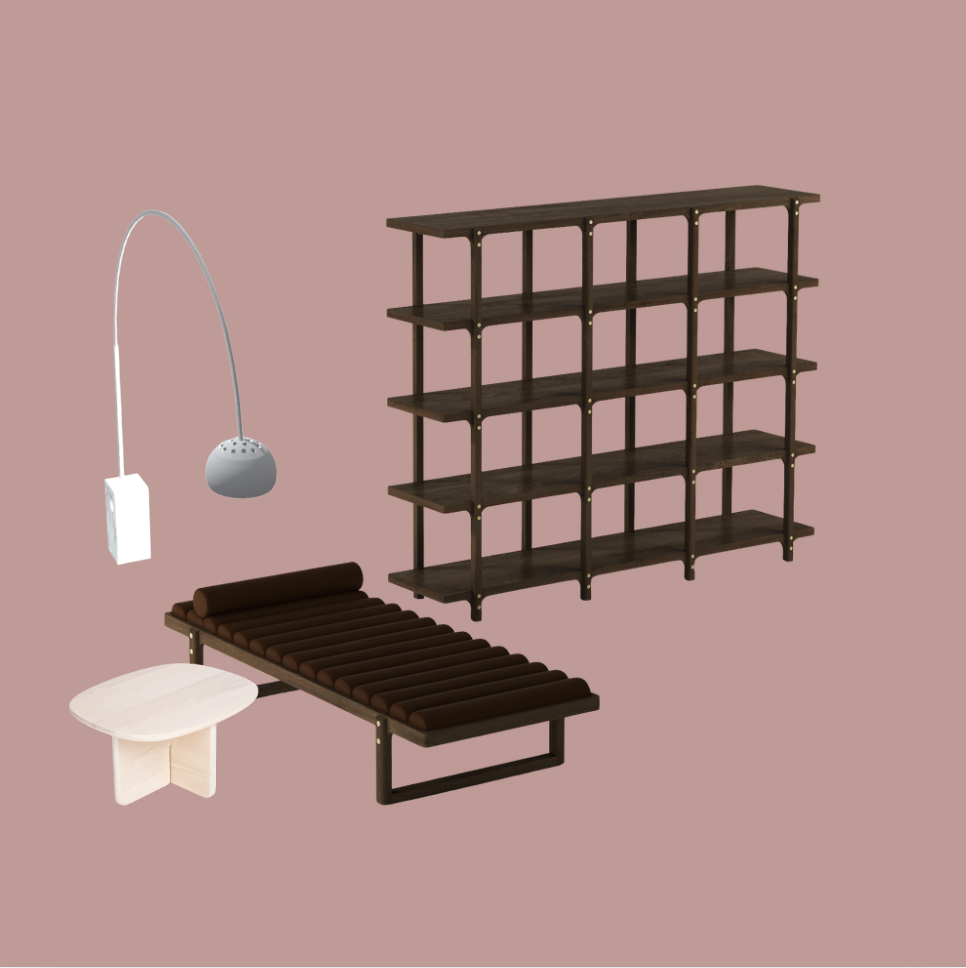 place these objects in a large intimate modern interior with a warm earthy architectural character the room features a high ceiling with exposed wooden beams running horizontally adding rhythm structure and depth the wood is dark natural and slightly weathered creating a grounded tactile atmosphere walls are finished in smooth warm clay toned plaster or tadelakt with subtle tonal variation and a soft matte surface vertical structural columns in natural wood are integrated into the space reinforcing the architectural grid and adding visual weight without ornamentation one side of the room includes a large window fitted with minimal horizontal blinds allowing controlled natural light to enter daylight filters in gently creating long soft shadows across the walls and floor and emphasizing the texture of the plaster and wood the light is warm and directional suggesting late afternoon sun the floor is wide plank wood in a muted natural brown tone with a matte finish the surface reads continuous and expansive supporting a calm residential scale the overall palette consists of warm browns deep taupes and soft neutrals the space feels enclosed yet open with strong horizontal lines deep shadows and a sense of depth created by layered planes and structural elements the architecture is intentionally restrained and monolithic designed to frame and highlight objects placed within it add a cream and gray colored carpet beneath the bench keep the perspective i gave yo