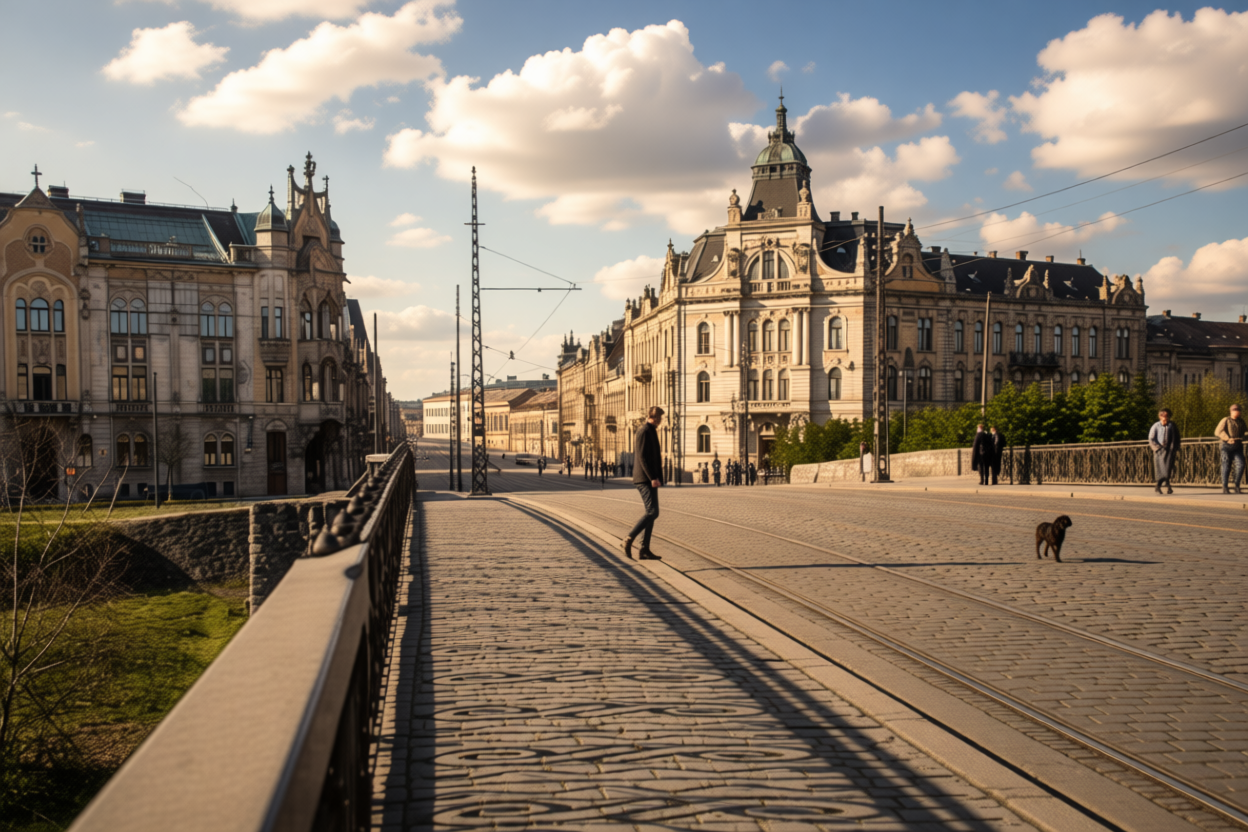 photorealistic aerial architectural render from an existing sketchup 3d city model maintain all original materials and surface definitions from the model asphalt areas remain vehicular roads only the elevated pedestrian boulevard between the front buildings is wooden decking not a road preserve the wood material texture and color exactly and treat it as a pedestrian only space do not add any cars vehicles or traffic elements add pedestrians only correctly scaled to buildings and street width walking and gathering on sidewalks and on the wooden pedestrian boulevard maintain accurate urban scale do not add people cars or bikes buildings retain original massing proportions and placement use natural daylight soft realistic shadows and professional architectural visualization quality camera retain camera as in original picture do not change camera placement show image exactly as it is in the exact angle that is shown do not alter camera placement avoid converting pedestrian surfaces into roads avoid altering or replacing materials avoid introducing new surface types all dark gray coloured roofs are solar panels reduce the solar panel module size so the grid is finer and realistically scaled not oversized