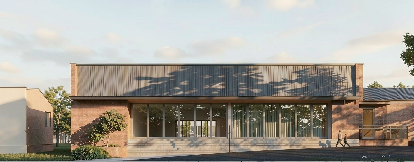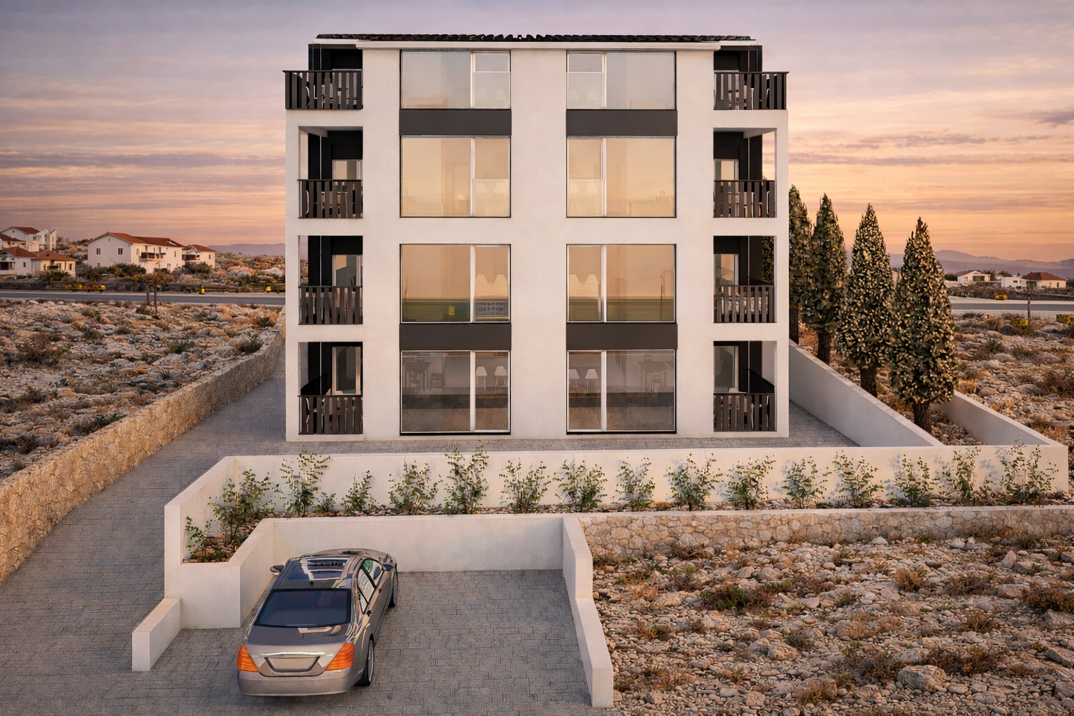 luxury modern apartment building premium architectural facade high end materials elegant combination of white stone plaster and warm natural wood panels dark matte metal details refined balcony railings large floor to ceiling glass with realistic reflections subtle warm interior lighting golden hour sunset lighting soft shadows cinematic atmosphere ultra realistic high detail architectural visualization preserve original environment exactly do not change terrain keep surrounding houses vegetation and car unchanged maintain original composition only enhance building facade
