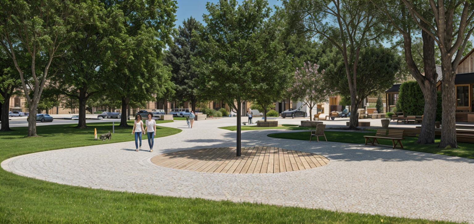 make this picture very realistic instead of the green area put there park grass instead of the paving there should be compact gravel natural material do not put the grass in the green circle there shoul be walkable modern wooden platform with tree in the middle in the background there is road with cars and high apartment buildings slovak architecture style add there people to make it more real