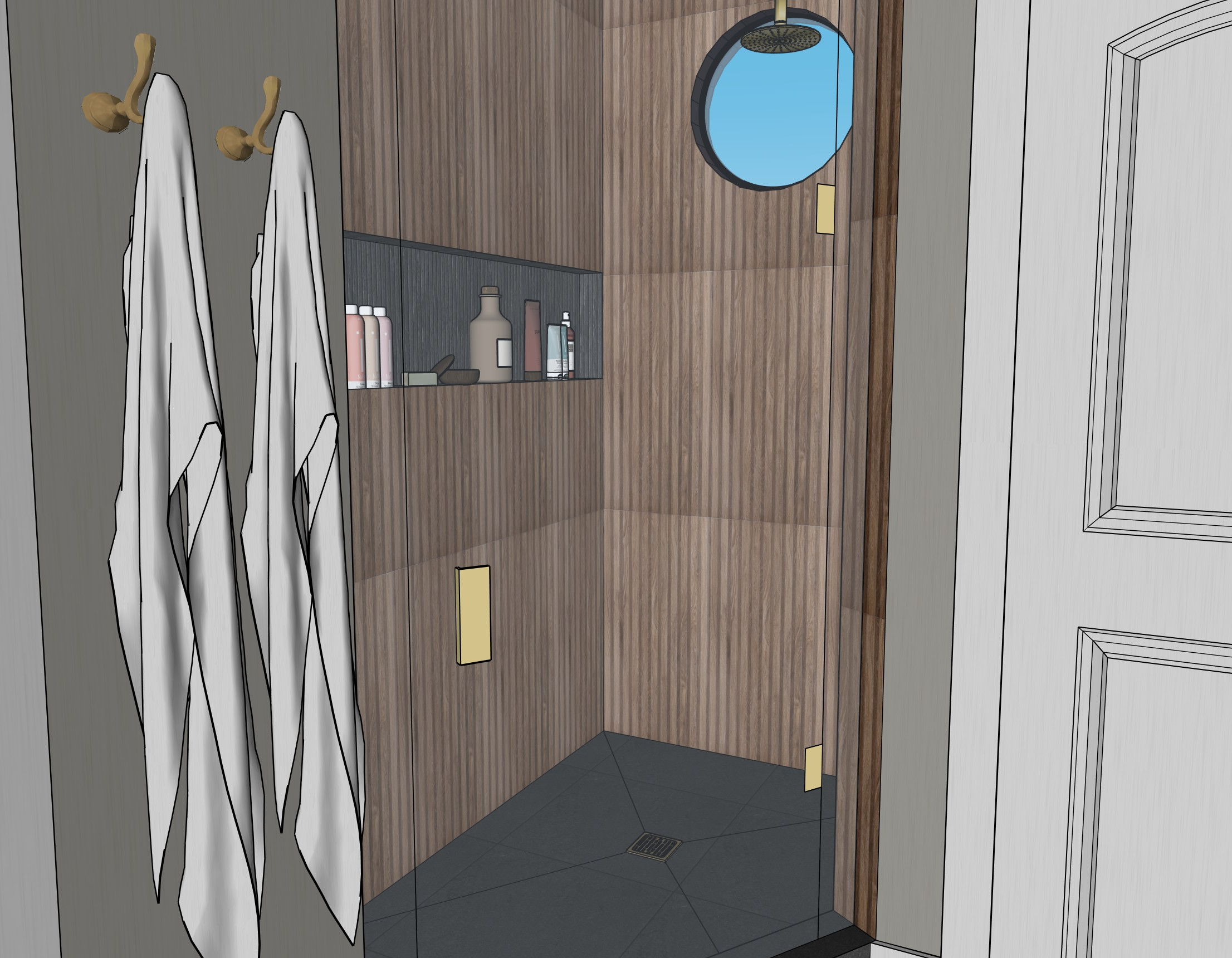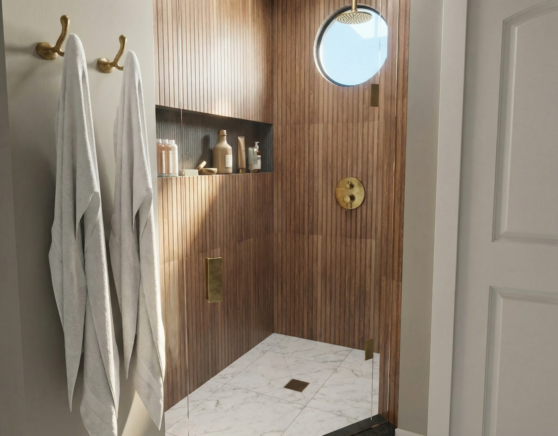 a modern bathroom with green tiled shower walls white marbled gray floor tiles brass fixtures and a round blue tinted window add white towels hanging on an antique brass hook capture a serene spa like atmosphere with natural light softly illuminating the space
