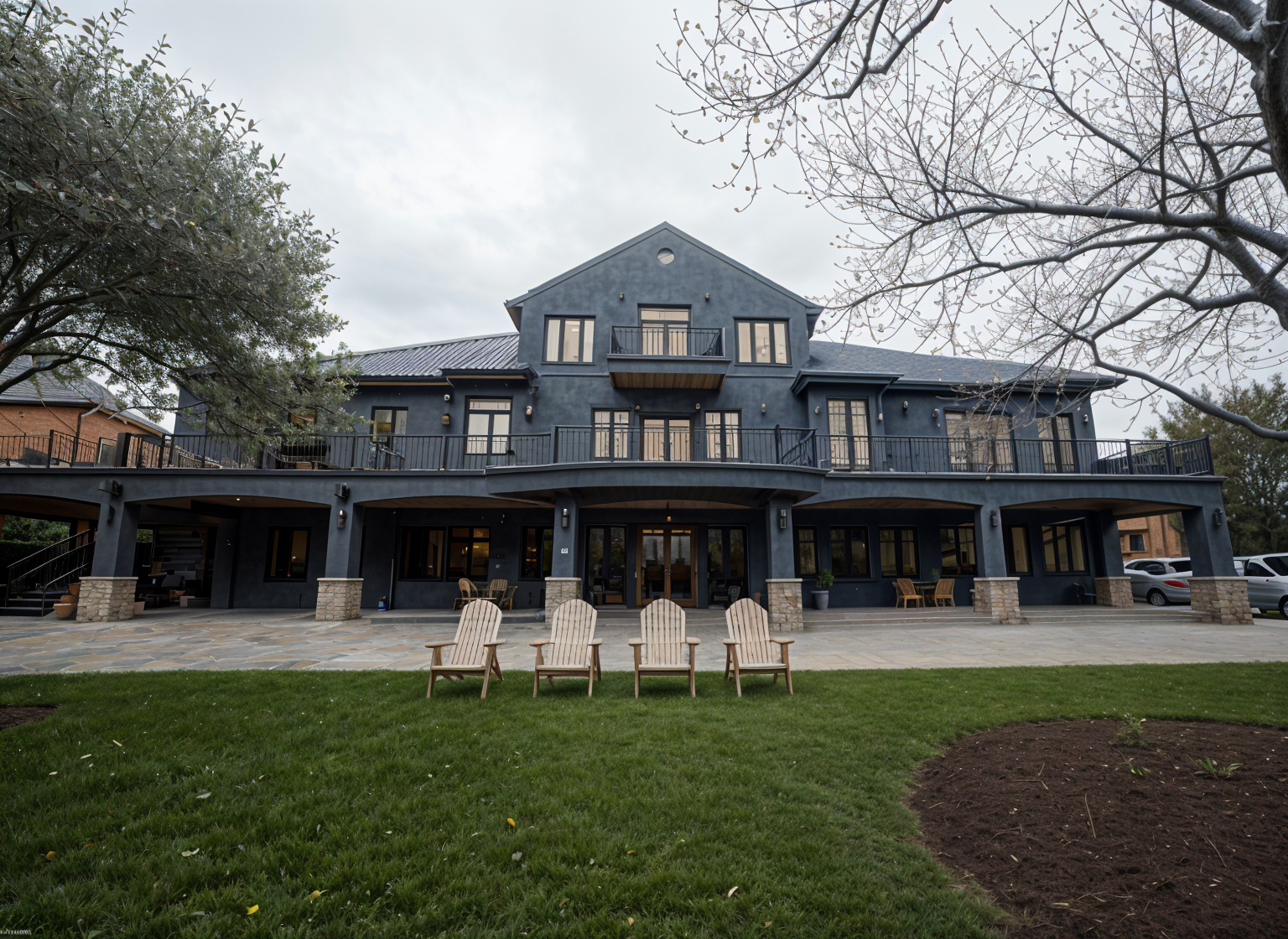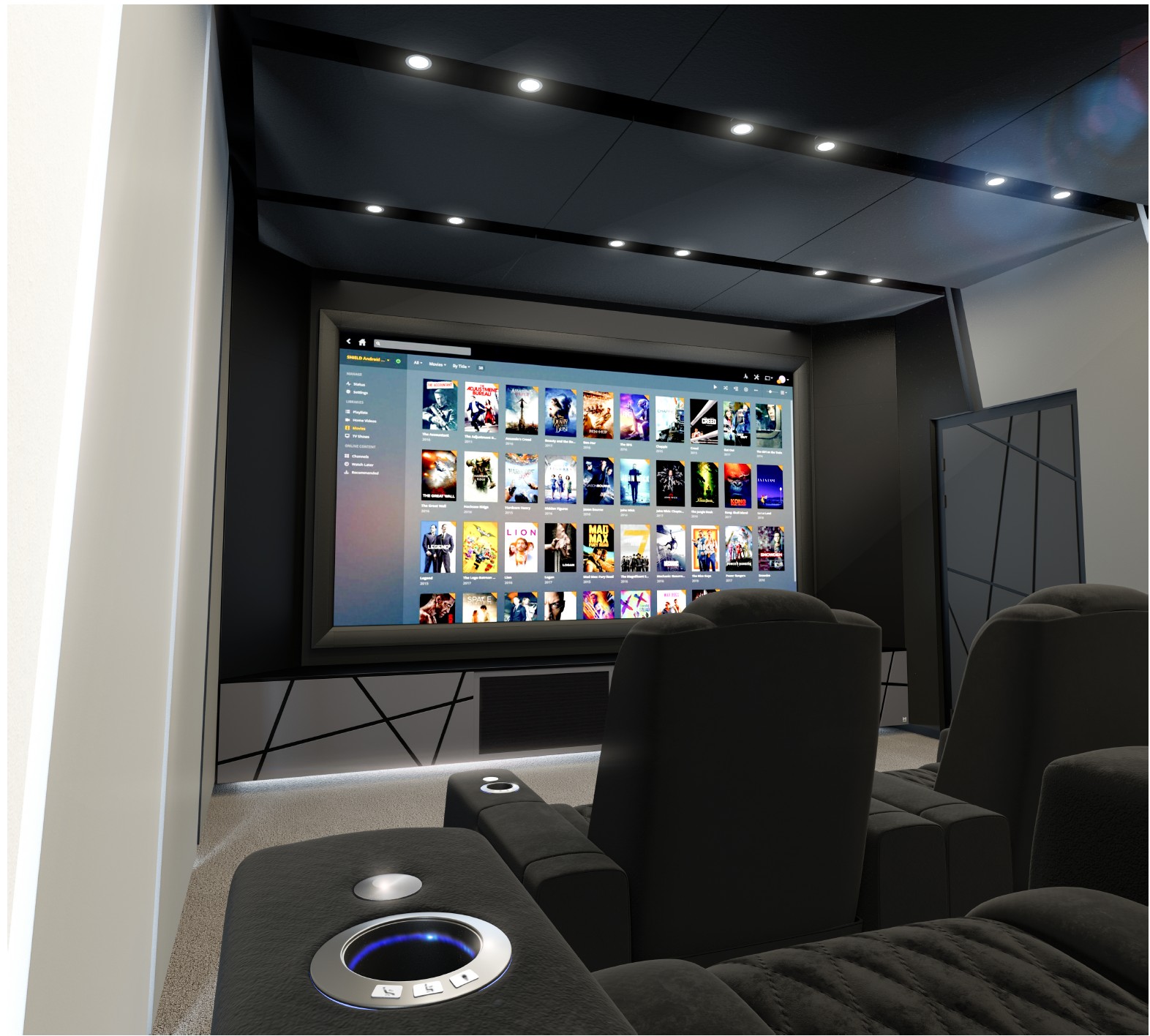 create a luxury home theater room with a sleek modern design the walls and ceiling feature a soft gradient from light gray to dark gray enhancing depth and style the seating is composed of plush comfortable black theater chairs lined up in a row the large screen displays vibrant movie covers the room is softly lit with recessed ceiling lights casting a warm glow a minimalist door adds to the contemporary feel with subtle geometric patterns incorporate a beige carpet to add warmth and contrast with the black furniture creating a cozy and inviting atmosphere