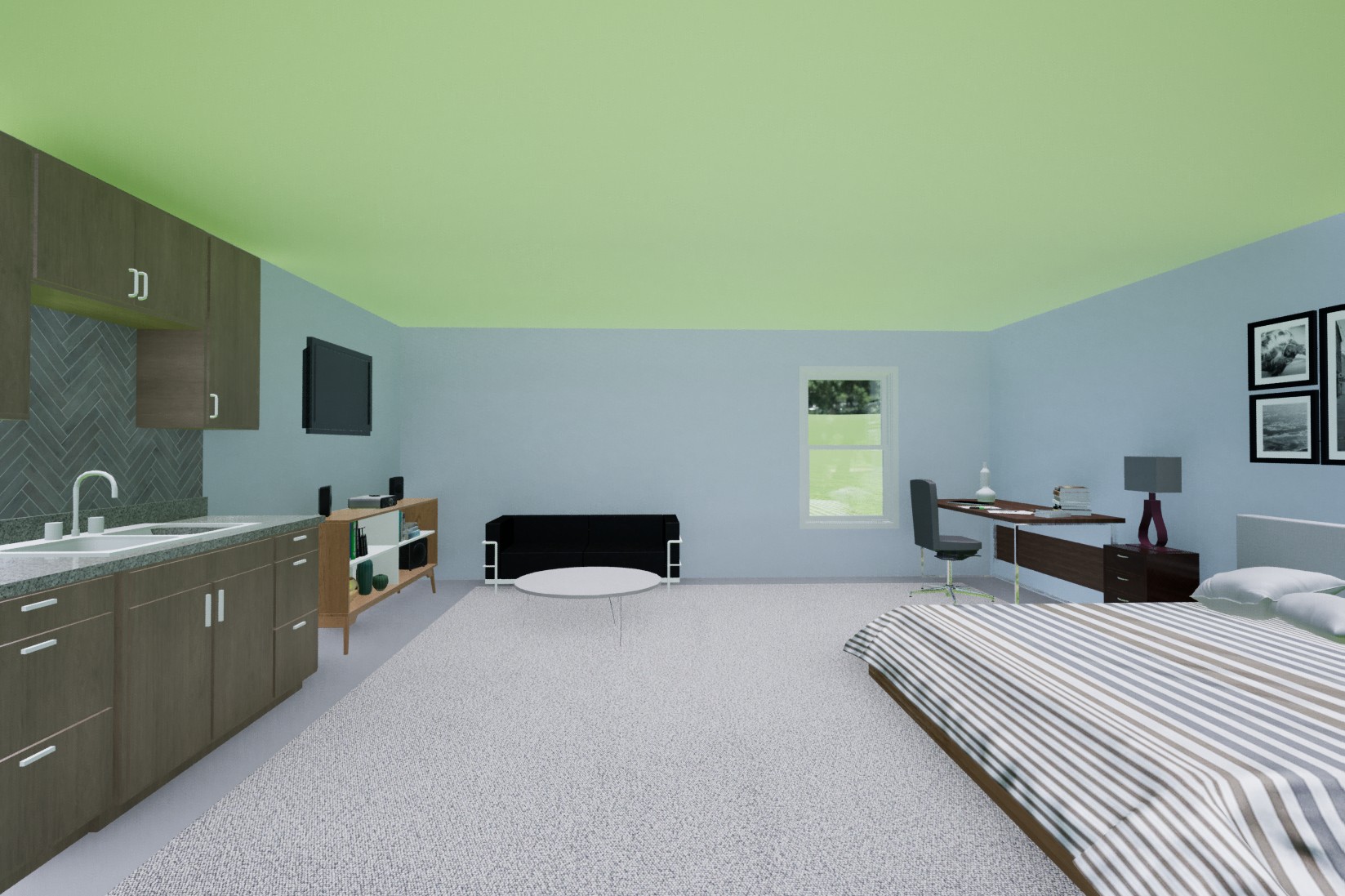 add a window behind the lamp change the sofa to a tan one add a rug under the bed add drapery to the windows