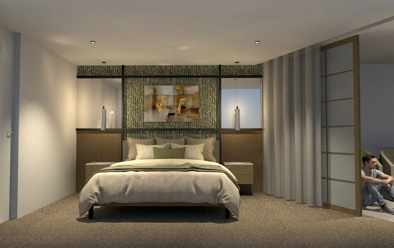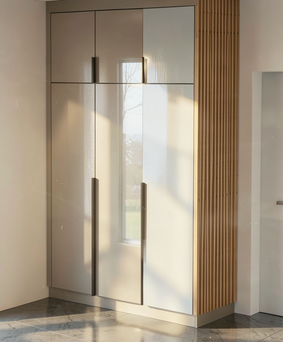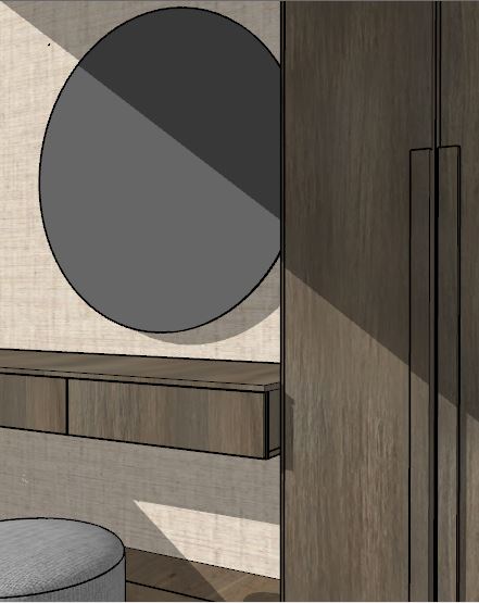 image type hyper realistic interior architectural render editorial style scene framing close up interior view maintain exactly the same crop composition and camera position as the reference image eye level perspective neutral lens 35 50mm no distortion main elements partial view of built in wardrobe vanity drawer circular mirror textile wall wood herringbone floor and pouf edge do not modify layout or proportions materials consistent with previous image refined realism floor wood herringbone natural wood parquet matte finish with soft subtle reflectivity fine grain realistic tonal variation no repetition artifacts wardrobe wood same tone as reference natural wood grain slightly irregular soft reflectivity low sheen never glossy surface must feel tactile slightly rough and natural eliminate any graphic or drawn outlines wardrobe edges very important remove black contour lines define edges only through natural shadow depth and material transitions soft realistic joints handles dark metal matte finish minimal reflection vanity wood same material language as wardrobe consistent tone and grain subtle realism no exaggerated texture wall textile continuous organic textile surface fine even texture warm beige tone slightly desaturated no seams or pattern repetition mirror circular mirror with subtle warm perimeter backlight soft halo effect integrated and elegant accurate reflection no distortion or overexposure pouf grey fabric pouf partially visible matte soft texture slightly darker tone natural volume through soft shading baseboard wall floor transition refined and clean junction between wall and floor minimal integrated baseboard or flush detail no visible gaps or graphic lines architectural and subtle lighting must remain unchanged preserve exactly the same lighting direction and contrast natural daylight with diagonal shadow crossing the scene no changes in intensity or mood mirror backlight remains subtle and secondary color atmosphere warm neutral palette wood tones beige textile soft greys calm editorial refined no saturation increase style editorial interior photography minimal elegant material driven poetic but restrained quality ultra realistic high resolution physically accurate materials pbr clean global illumination no noise no artifacts restrictions do not alter composition or crop do not introduce outlines or graphic edges do not exaggerate textures do not oversaturate colors the skirting board is made of wood in the same tone as the floor