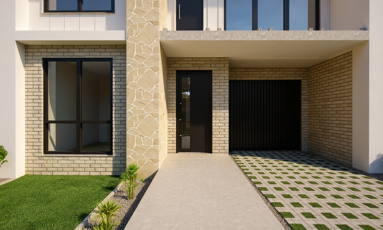 photo of a modern residential building featuring clean lines and a minimalist design emphasize smooth stucco walls and large glass windows framed with dark horizontal slats set in a lush urban garden surrounded by vibrant greenery and colorful flowers natural daylight brightens the scene casting soft shadows across the lawn captured from a low angle to accentuate the building s height against a clear blue sky using a wide angle lens to enhance the surroundings and create a sense of openness in the composition