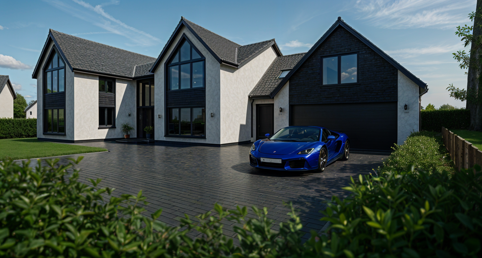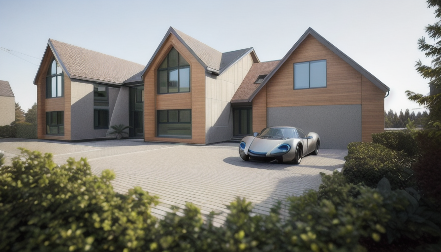 maintain design do not change any shapes or sizes do not change the car add external lights to either side of garage doors and feature windows central to wall add guttering and rain pipes to walls create realstic glass reflections with soft internal lights gentle warm summer glow realistic clouds and shadowing realstic landscaping