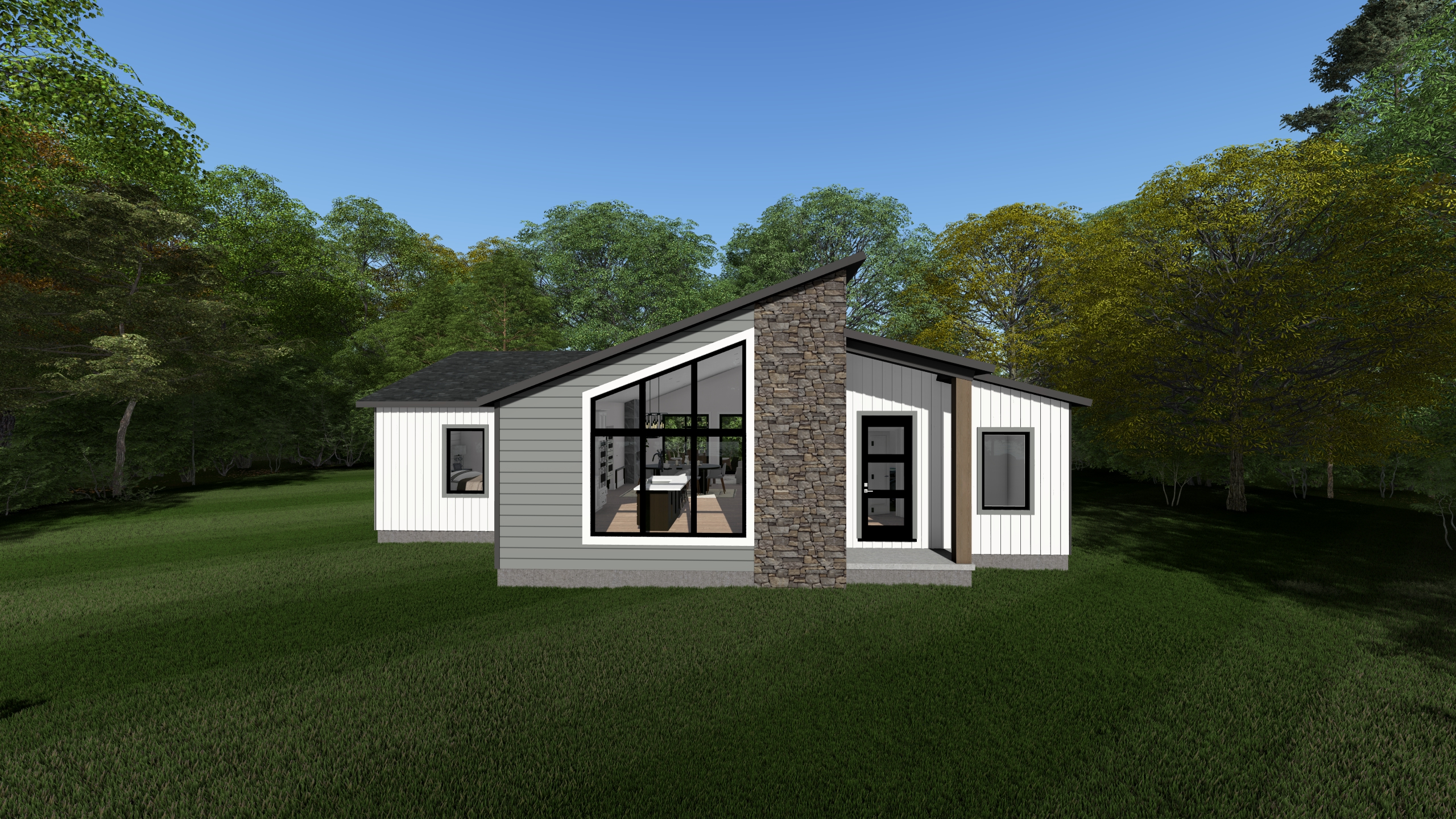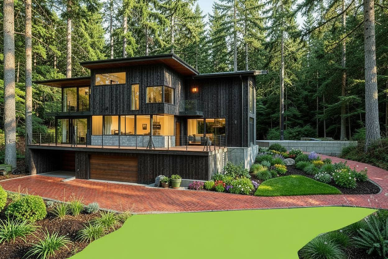 make a photorealistic image while keeping textures the same as selection professional landscaping in a lightly wooded scene