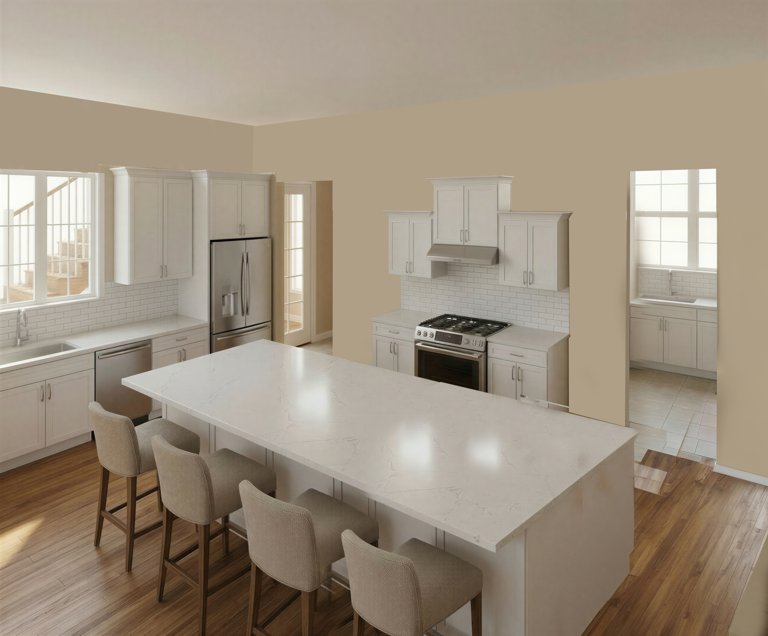increase the size of the range to a 48 inch model add additional cabinets to either side of the range extend upper cabinets to the ceiling