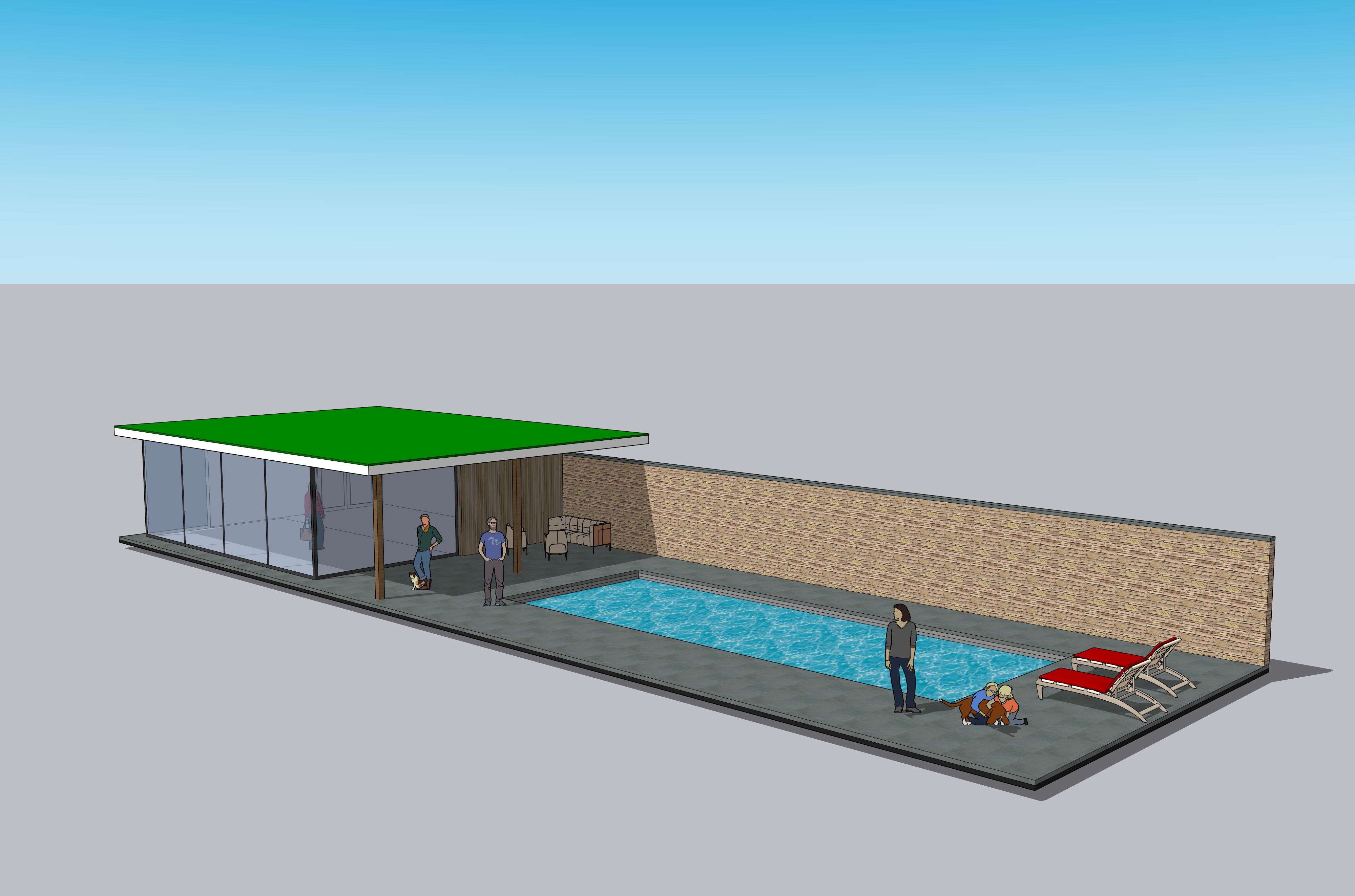 make a photorealistic rendering of the poolhouse the weather is sunny with a few clouds in the sky add a lot of people bushes trees and flowers the time of day is the golden hour