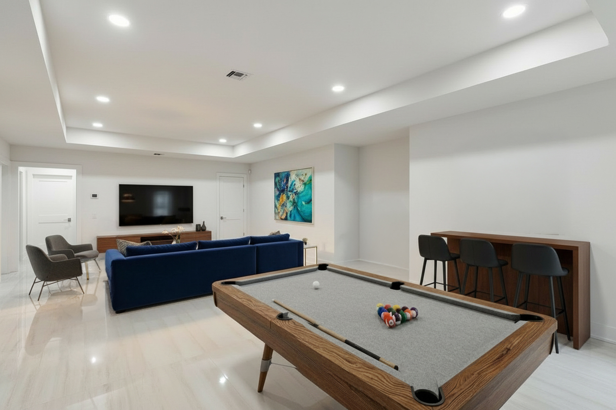 show the room bigger change the furniture to more neutral and beige