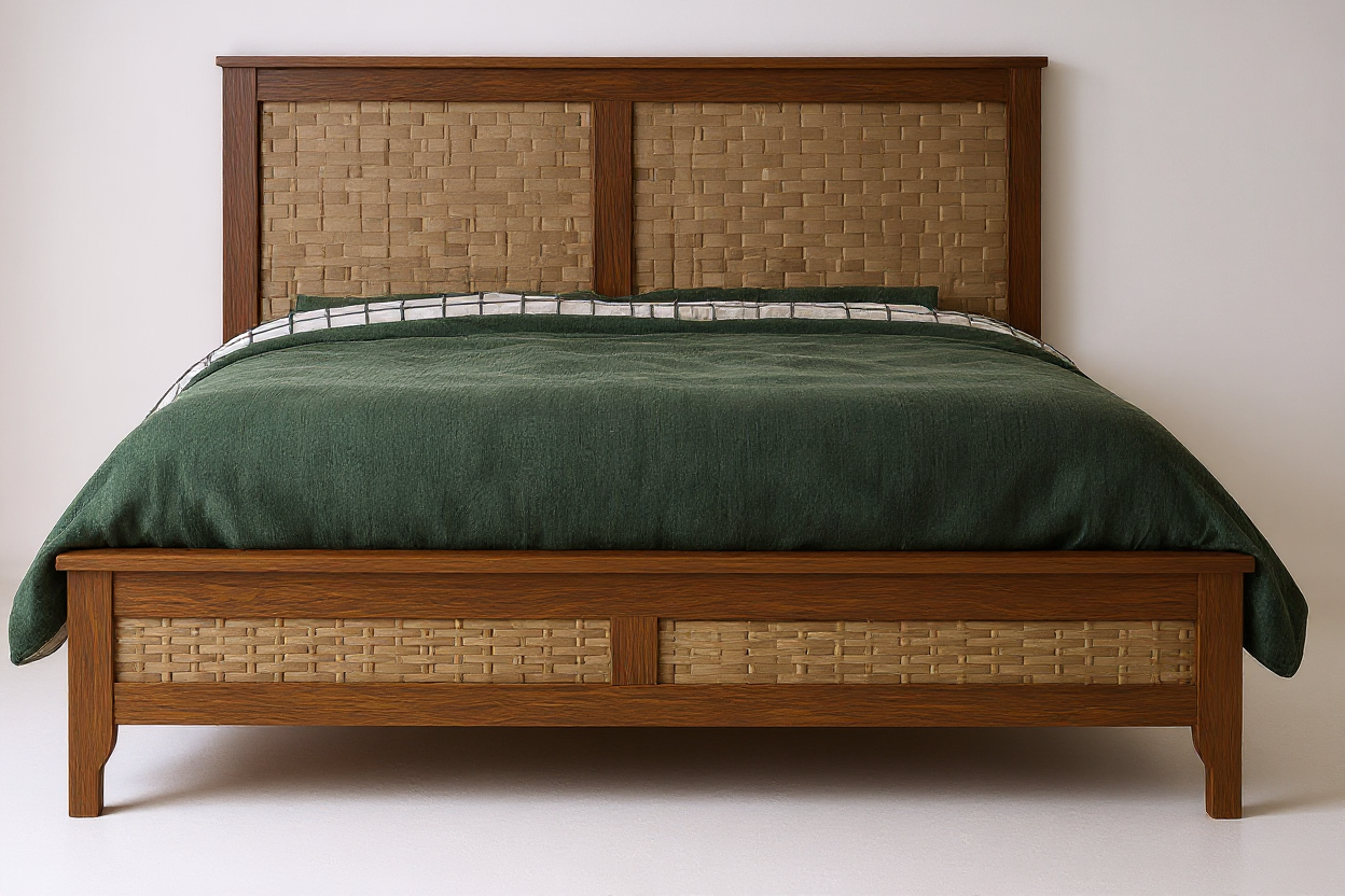 lighter grayish brown toast almond wire brush finish bed to match the weaving white beddings and pillows
