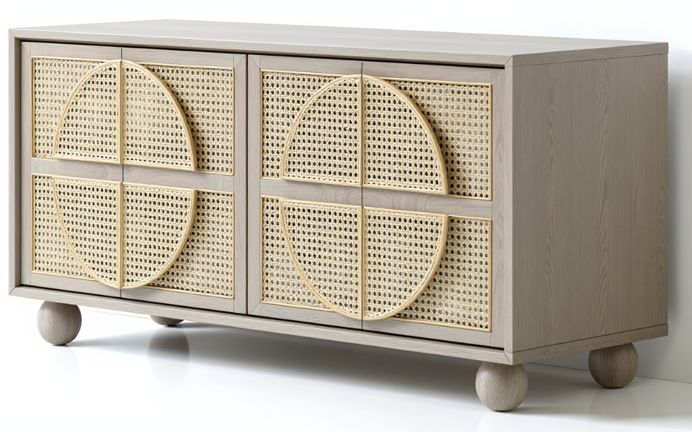 light grayish oak wire brush finish with light ivory rattan weaving cabinet doors white background
