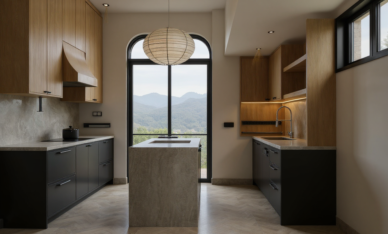 cream tile flooring light grey counter top turn on pendant light led strip light