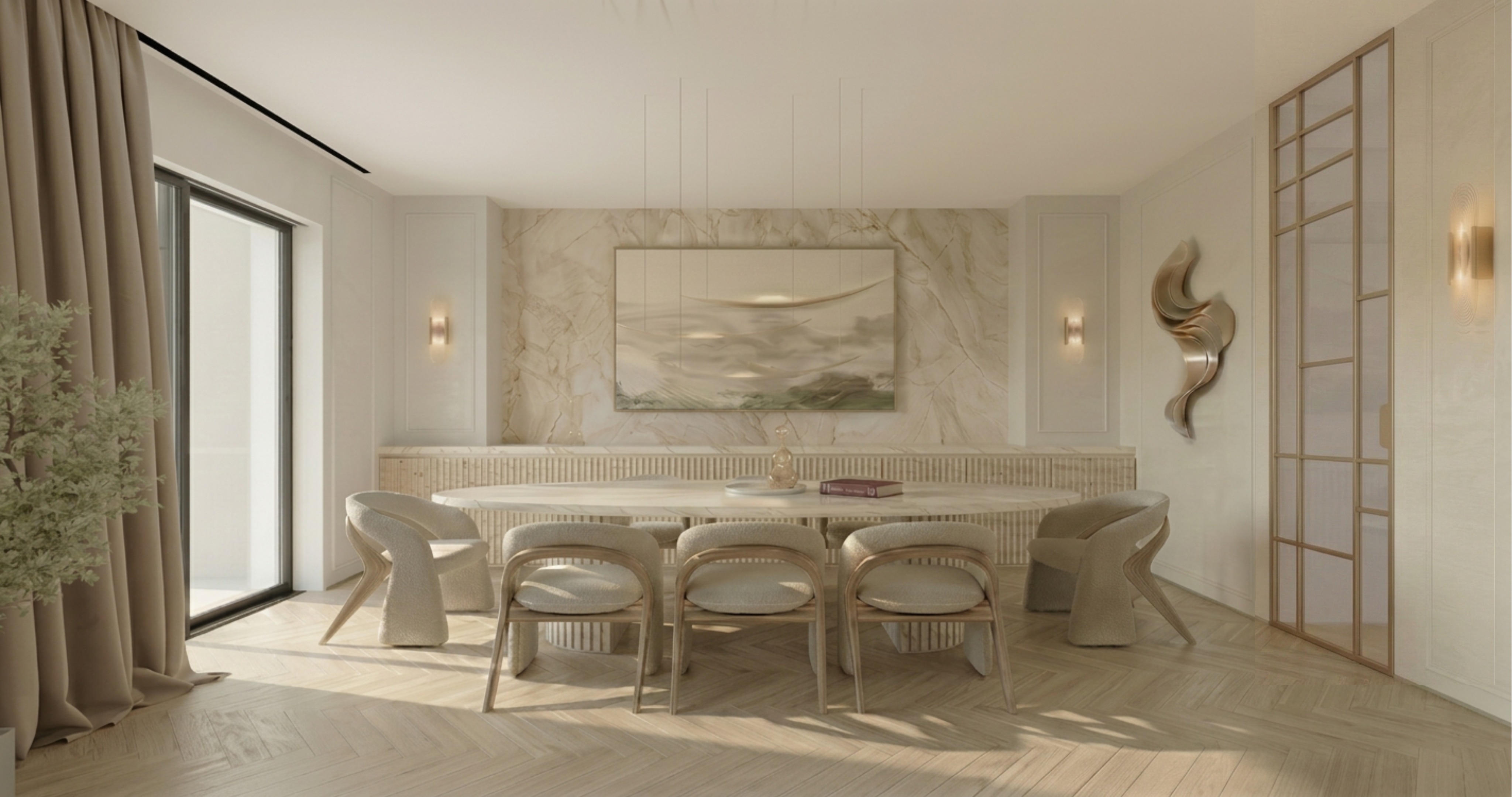 take this semi final render and enhance realism without altering any of the current image s geometry features or objects as well as image orientation no cropping zooming etc final result must be 4k do not add any new objects keep the herringbone pattern exactly as is but increase the tonal variation between individual planks each stave should have a distinct natural shade ranging from light sand to muted beige change the surface to an ultramatte raw timber texture with visible open grain removing all artificial sheen or plastic like smoothness the goal is to see a clear organic contrast in color from one tile to the next emphasizing its wooden nature yet making the effect visible yet delicate and so it doesnt stand out too much the goal is for the change from the original to be subtle as for the materials though its important to make them clear and visible we are aiming to respect the softness and elegance of the composition as a whole for that reason no exaggerated contrasts or saturations are welcomed here mind you the door was collaged into the composition which means you might need to slightly adjust the ceiling and flooring particularly the junction with the wall s finish recessed baseboard as well as the floor tiles near the door as a part of it is also part of the collage the goal is for the composition to look realistic result must be elegant clear yet soft with soft lighting too and no rough contrasts high res 4k for client viewing increase lighting and contrast slightly