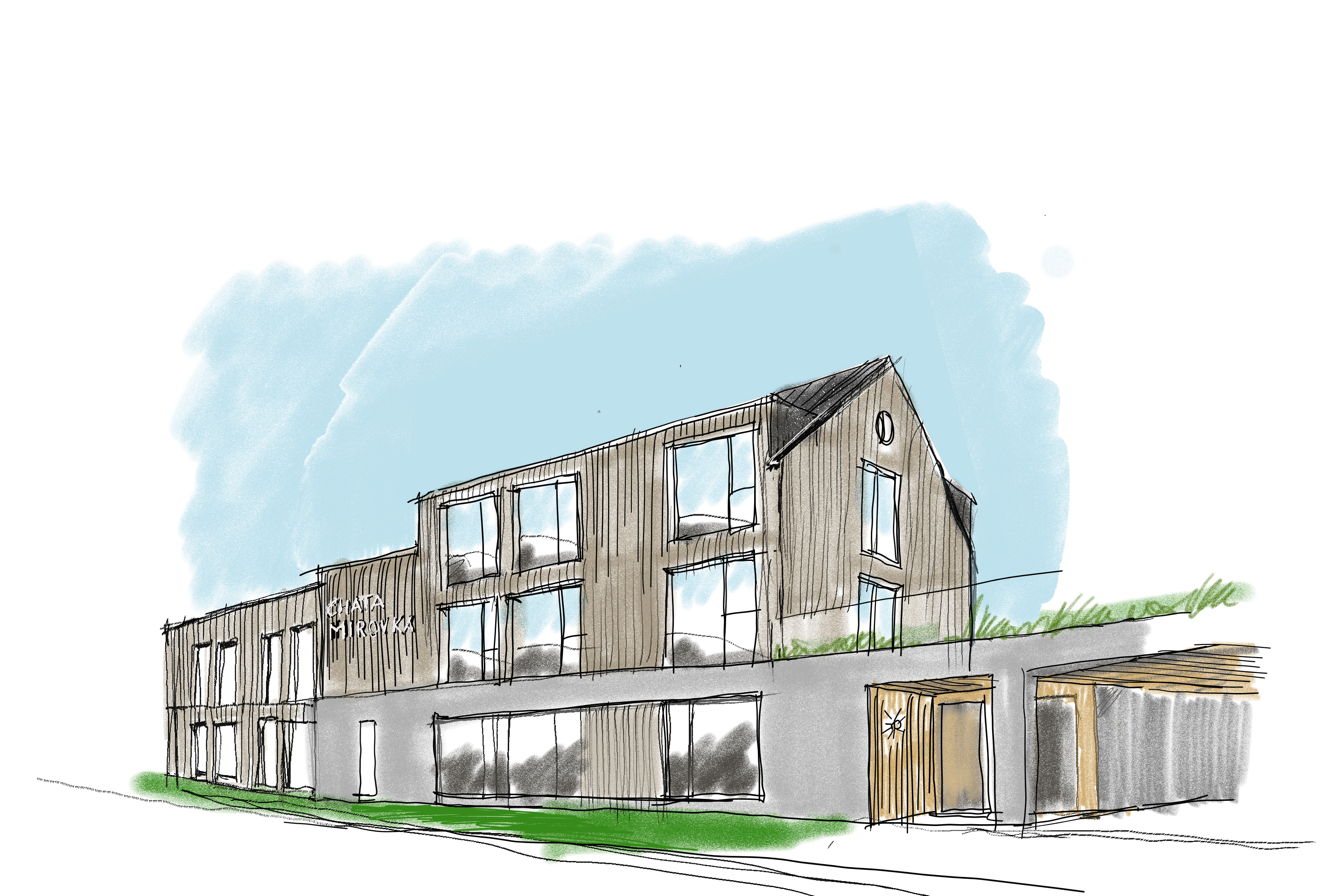 contemporary mountain lodge with stepped volumes three story structure combining a gabled top floor and flat roofed lower wings large floor to ceiling windows vertical timber cladding minimalist scandinavian aesthetic integrated green roof on lower level warm natural materials shaded entrance canopy soft daylight surrounded by green landscape rendered in architectural sketch style hand drawn linework with subtle watercolor shading earthy tones loose pencil strokes light sky wash clean composition professional architectural illustration