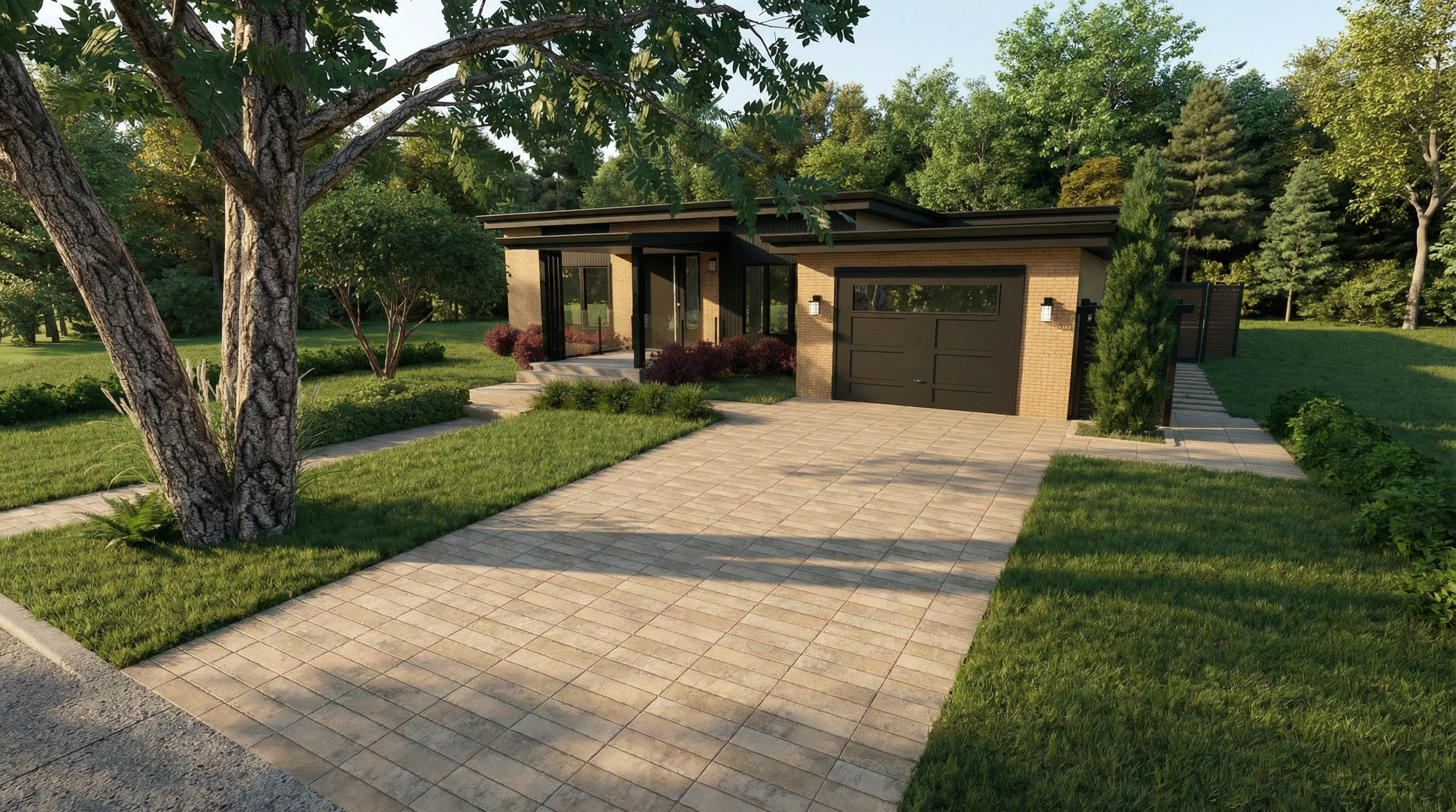modern florida home add a yard driveway and the sides of neighbors houses needs to be zoomed out so you can see a blue sky with fluffy clouds