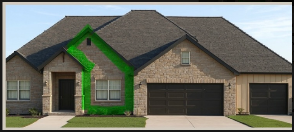 replace the green highlighted area on the front elevation with the same taupe board and batten siding used above the single car garage on the right side of the house match the exact color material and texture of that taupe board and batten siding maintain the same lighting shadows perspective and rendering quality as the rest of the image do not alter any other parts of the house landscaping driveway or sky ensure the edited area blends seamlessly with the surrounding stone and trim details