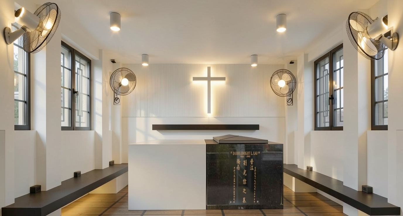 light at the cross and white fluted panels