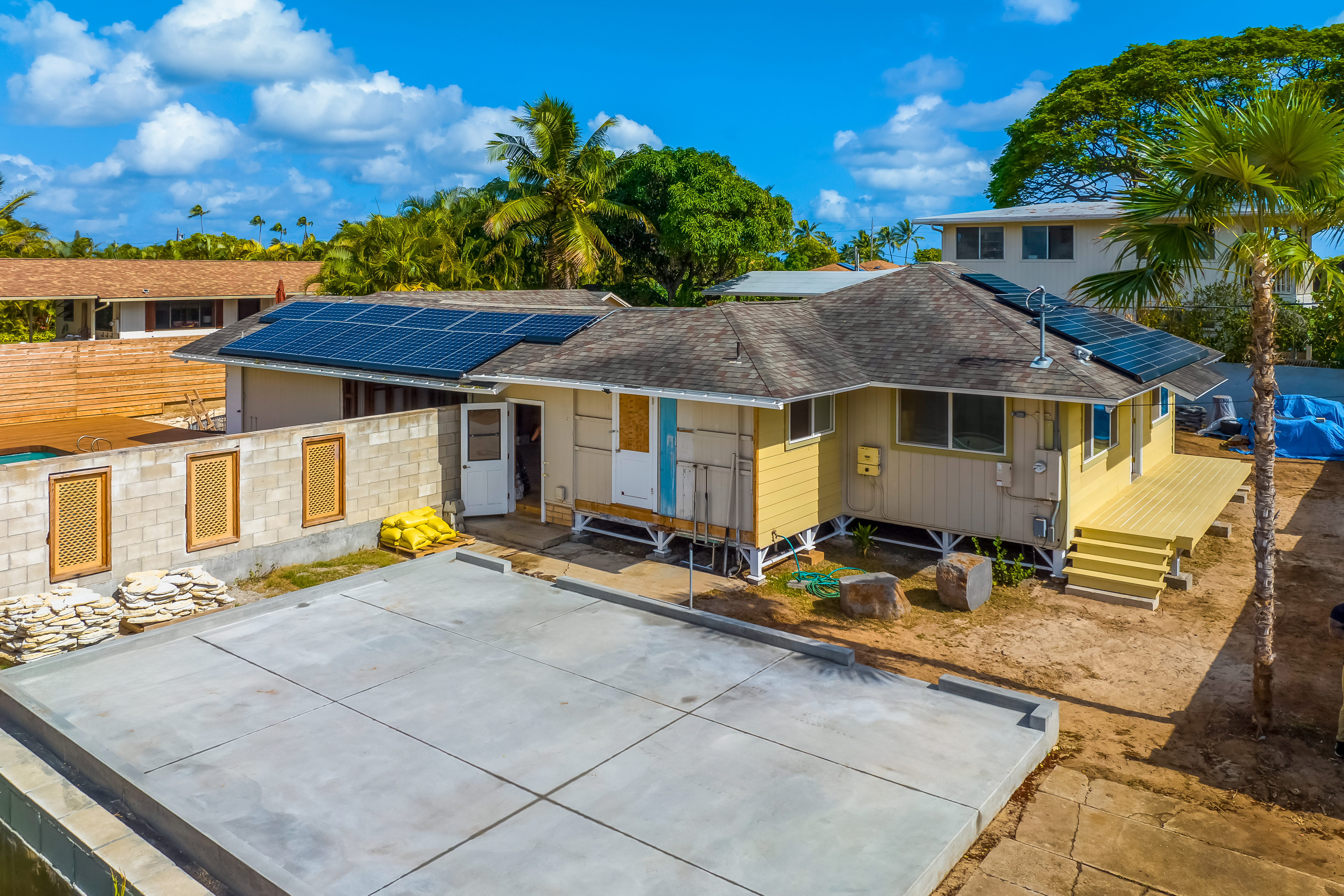 modern agrarian style exterior shot dark cedar wood stone driveway set in hawaii architecture