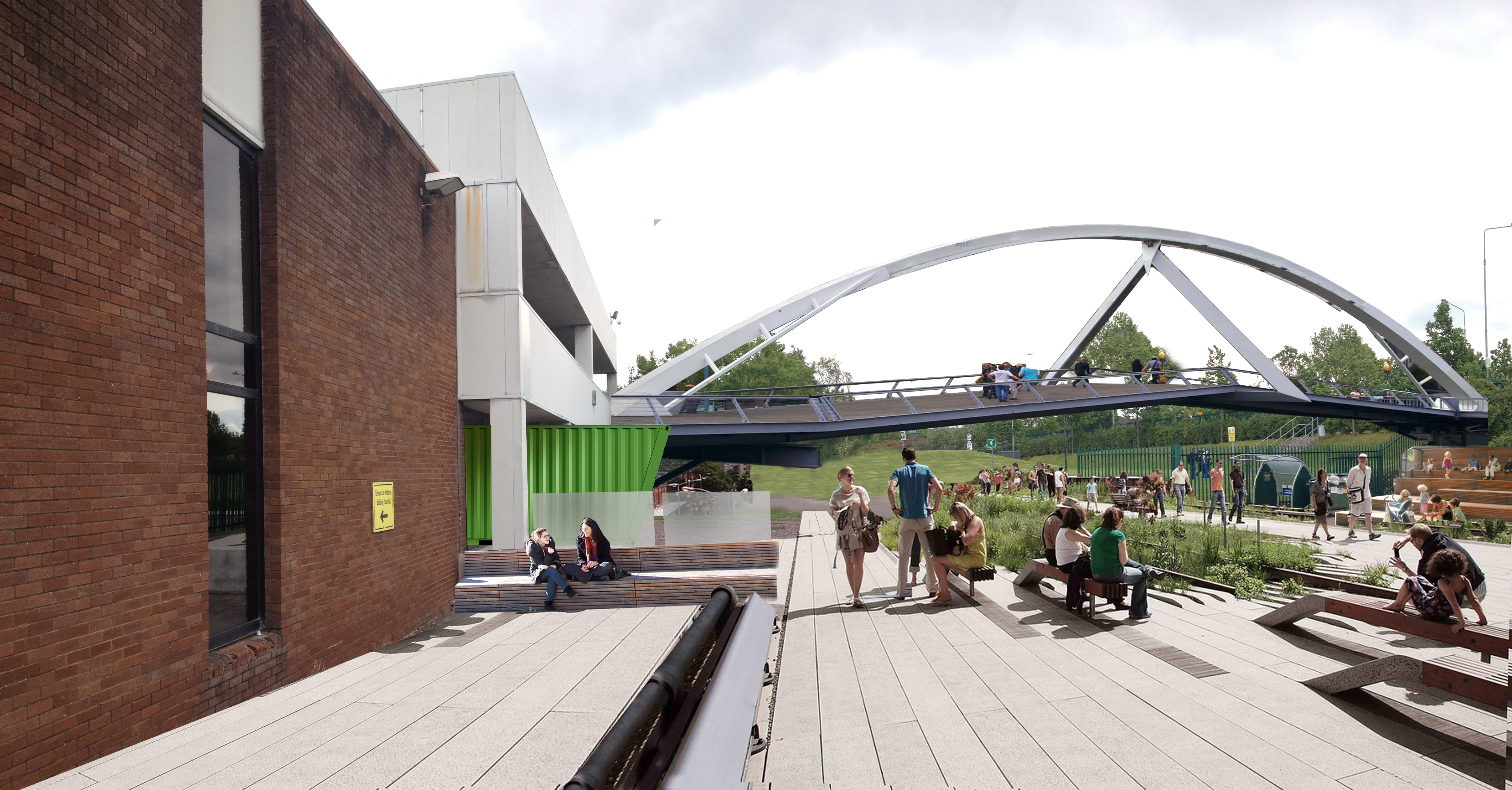 a bustling urban park scene with a contemporary steel bridge arching over a pedestrian path the bridge is sleek and silver complementing the vibrant green foliage in the background the building on the left is constructed from warm rustic red bricks contrasting with the modern white and grey structure beside it the ground is lined with soft beige and grey tiles providing a neutral base for the colorful scene people are scattered throughout engaged in leisurely activities creating a lively and dynamic atmosphere bright green accents can be found in the surrounding plants and a vivid green segment of the building s facade the sky is a gentle overcast with shades of light grey and hints of white casting a soft diffused light over the entire scene overall the atmosphere is vibrant and lively filled with the energy of a community enjoying a shared public space