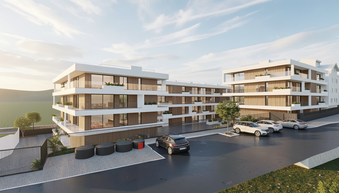 pensa como arquiteto e cria uma fotografia ultra foto realista deste render sendo que o ed ficio novo coloca o c u com umas nuvens ligeiras