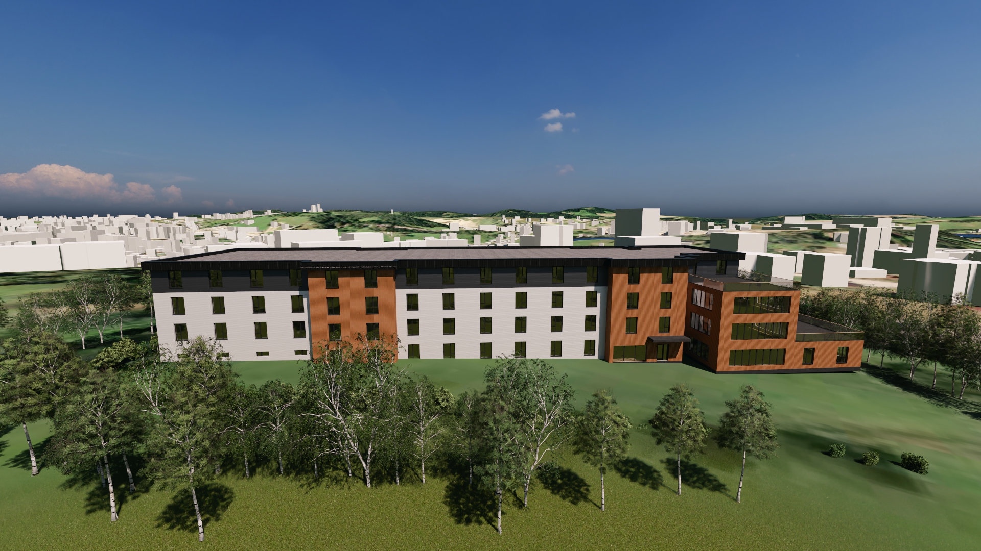 add parking to front add sidewalks to entrances add interiors add curtains add jalousie to windows light up interiors
