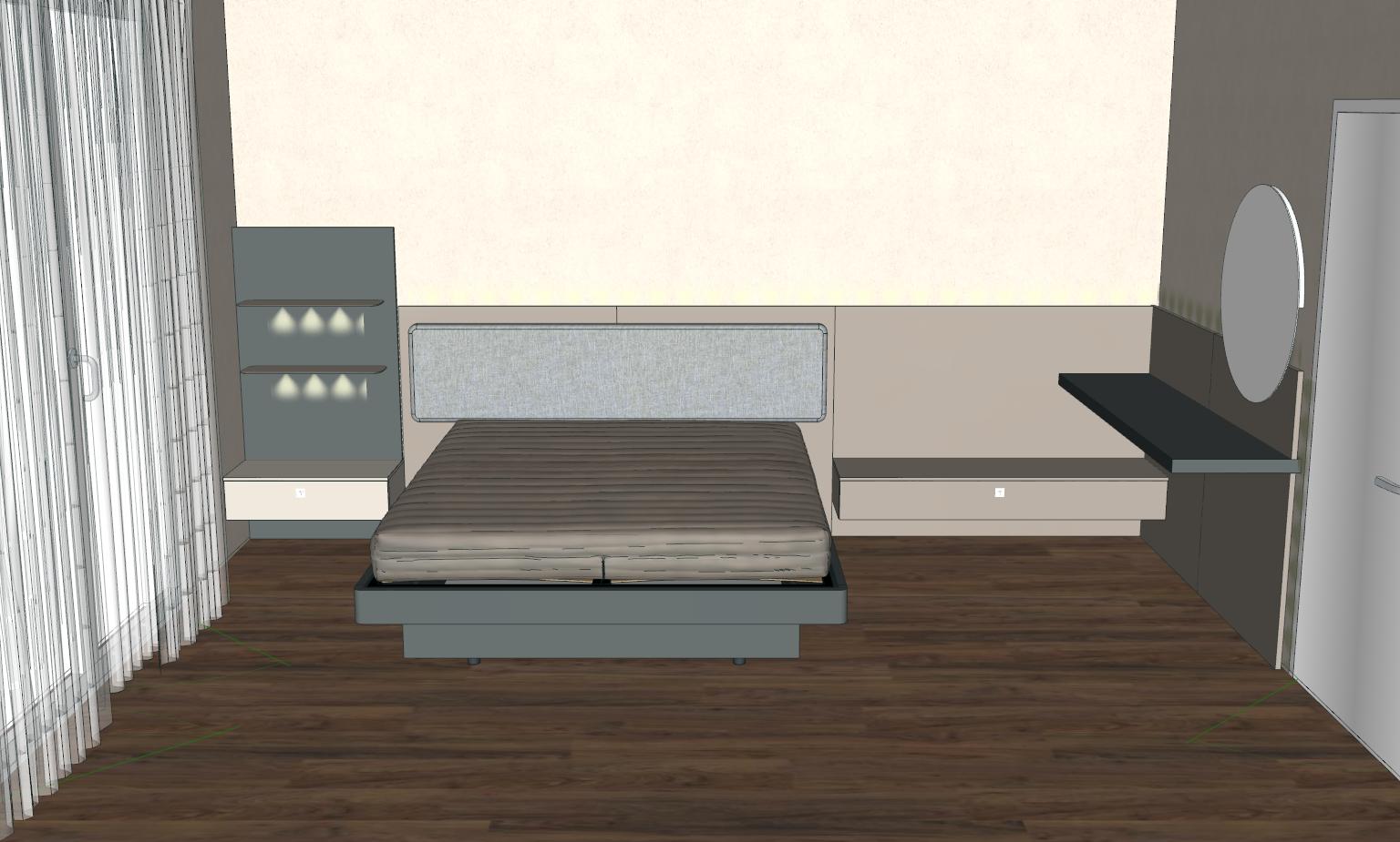 render a modern bedroom with a minimalist design the bed is central with a soft light gray upholstered headboard use a warm beige color for the walls to create a cozy and inviting atmosphere the shelving unit on the left is a sleek matte charcoal gray with subtle ambient lighting showcasing small decorative items the floors are rich wood adding depth and elegance to the room incorporate sheer white curtains on the left for softness and allow diffused natural light to fill the space include a simple elegant mirror on the right positioned above a streamlined black desk ensure the atmosphere is serene and calming with a harmonious color palette of grays beiges and browns