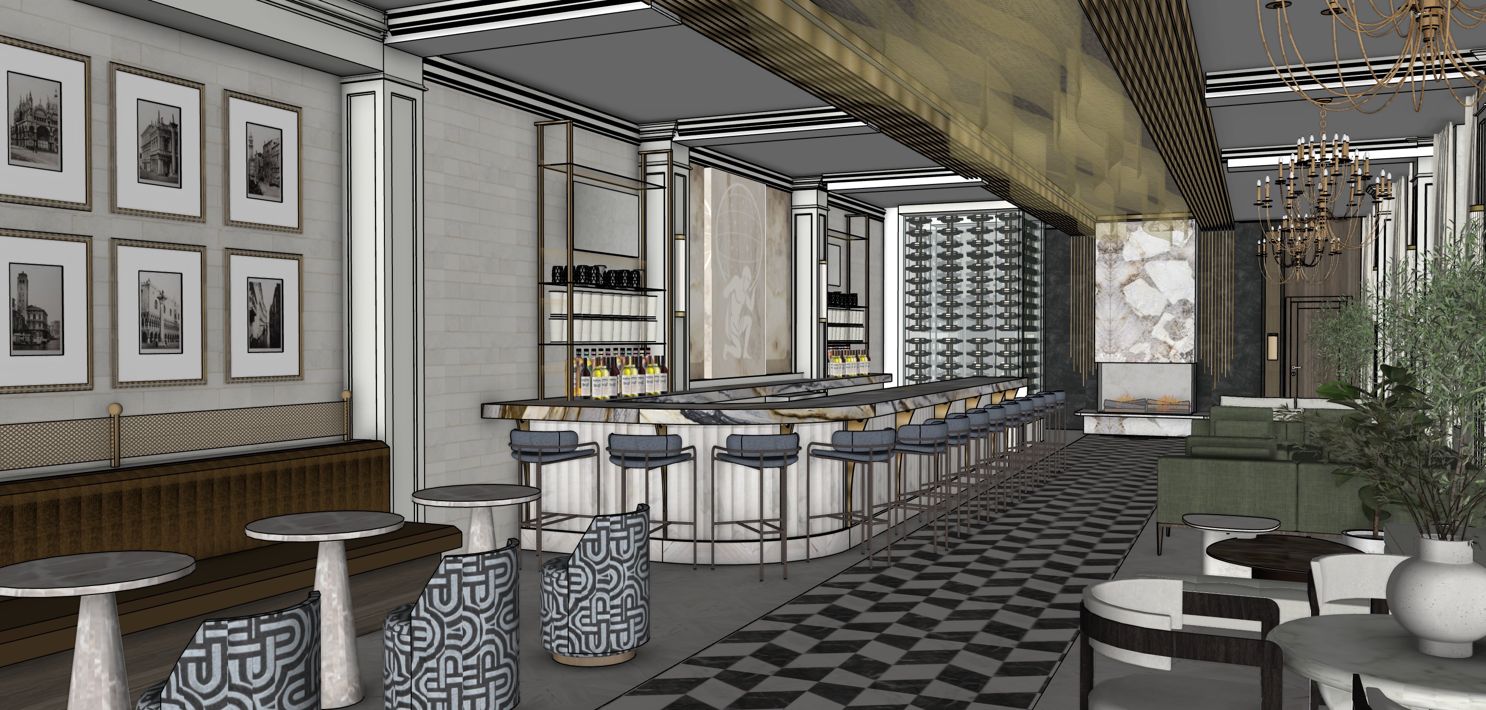 soft lighting on the brass metal chain waves on the ceiling lighting on the bar shelving under counter lighting under the bar top glow in the logo at the center on the bar real fireplace
