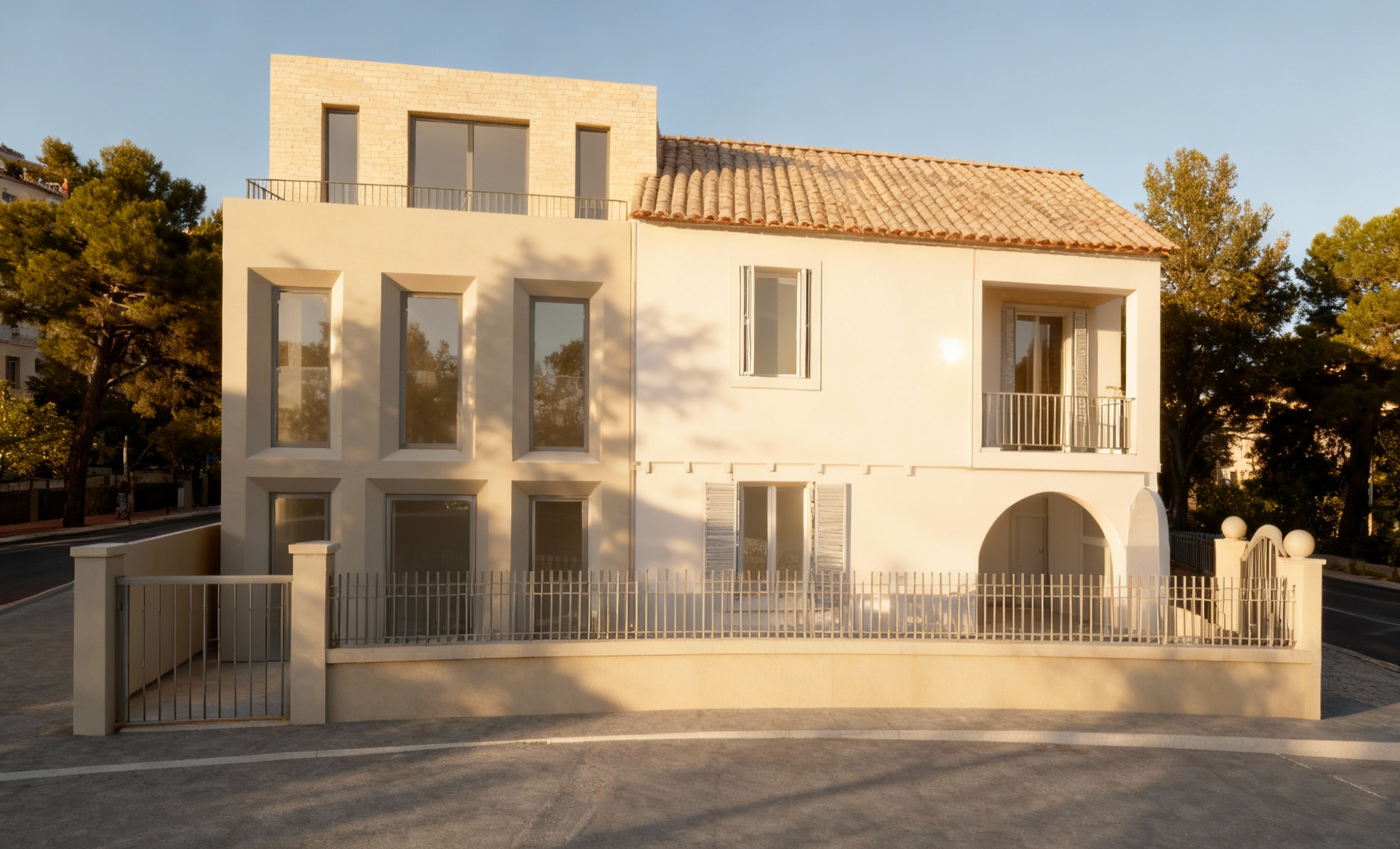 lot of reflects and sun light the sun illuminates the facade that we see some trees and a street of marseille in the backgroung facade more in the light more reflect all is painted no stone the fence wall is beige like the extension more shadows of trees on the facade the fence and the building on the left are same color the attic is in little beige bricks more realistic view my point of view