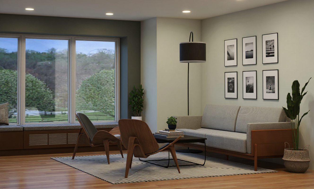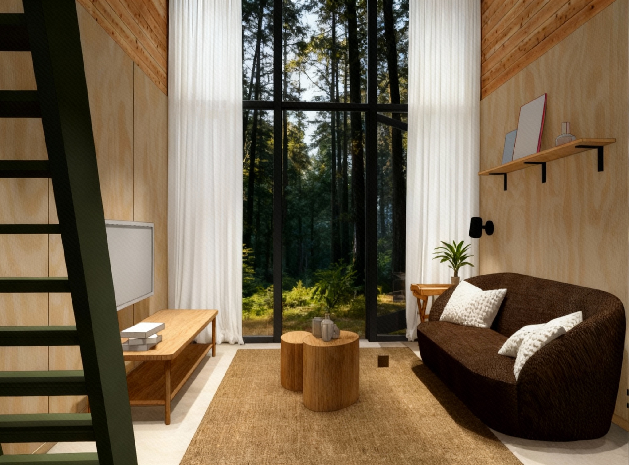 make it realistic forrest outside see trough curtains white give the cushions texture make the materials more realistic make the tv real make the books real make the decoration on the shelf real remove the cube on the carpet make the plant on the side table real give the painting colour