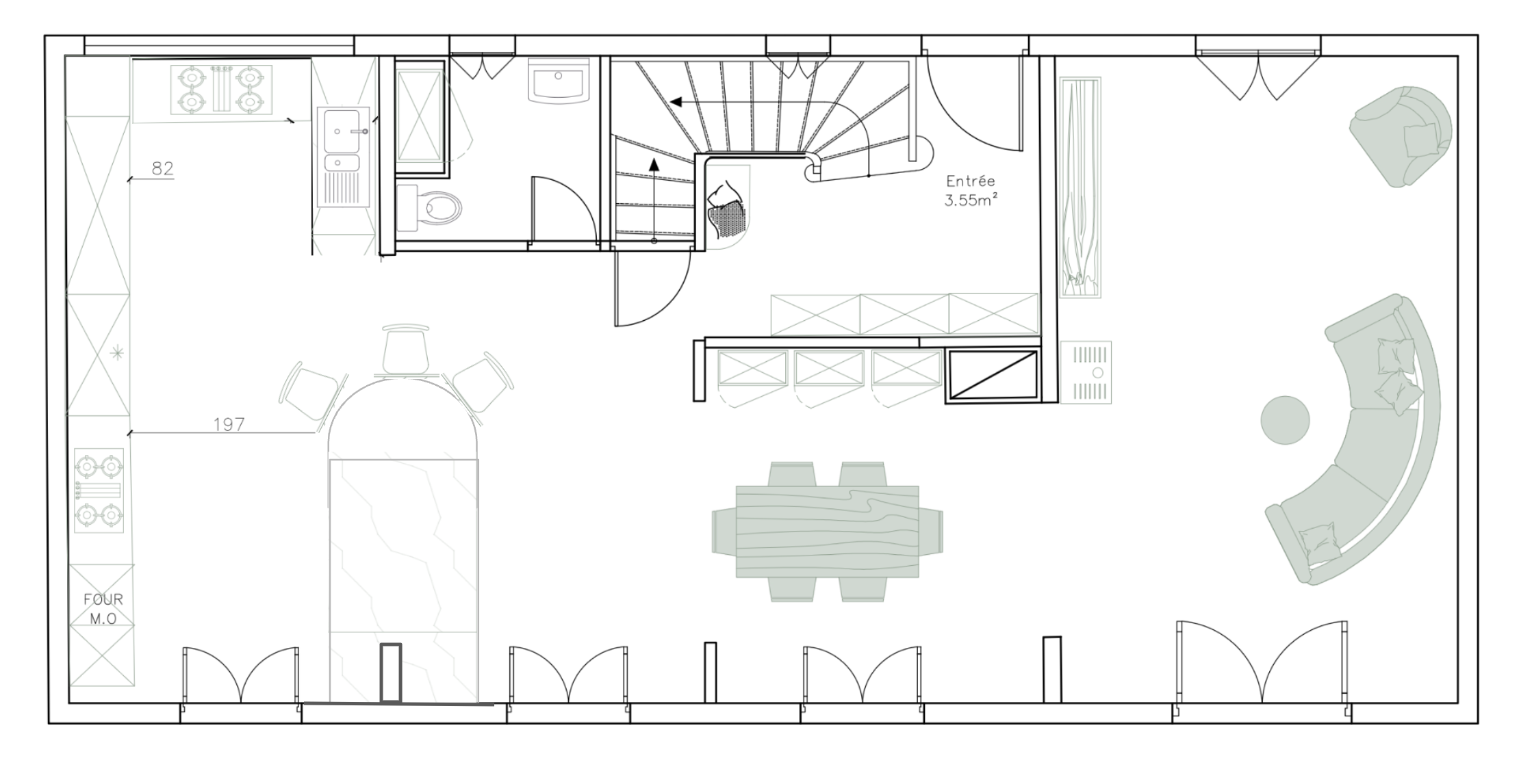 convert this floor plan into a realistic isometric 3d view of a full house show the space from an elevated angle with furniture walls and details visible modern style use the same furniture as shows on the plan do not change the orientation of the floorplan