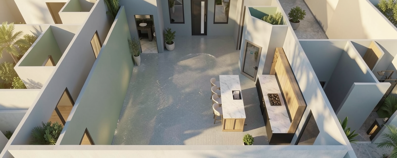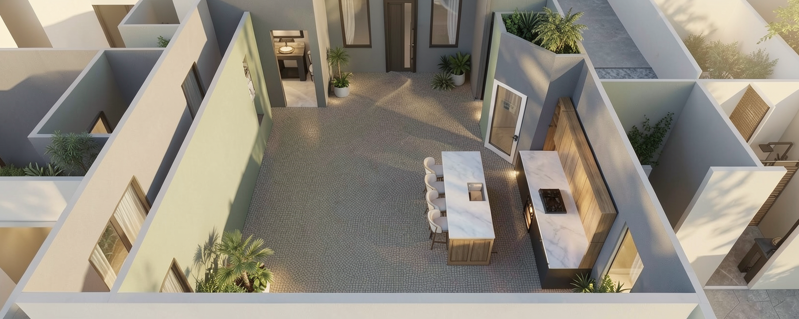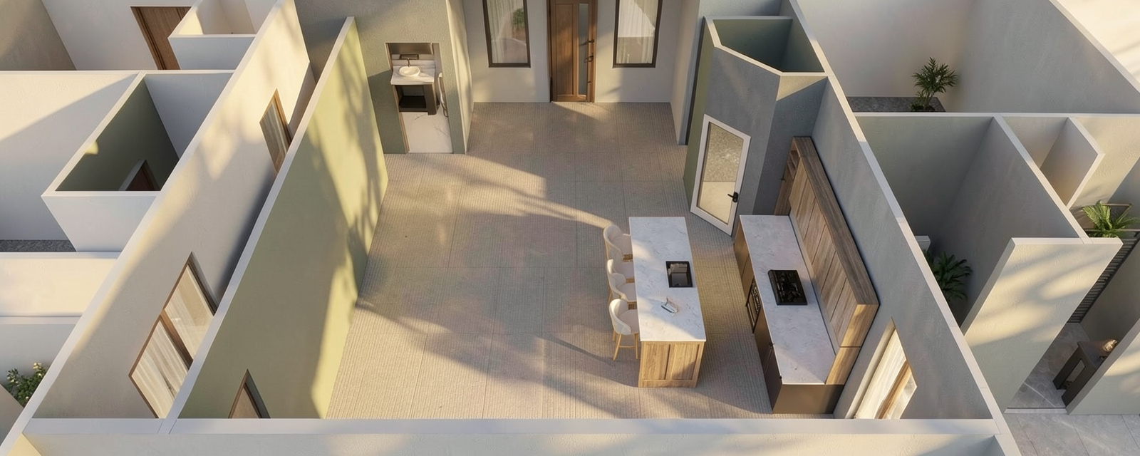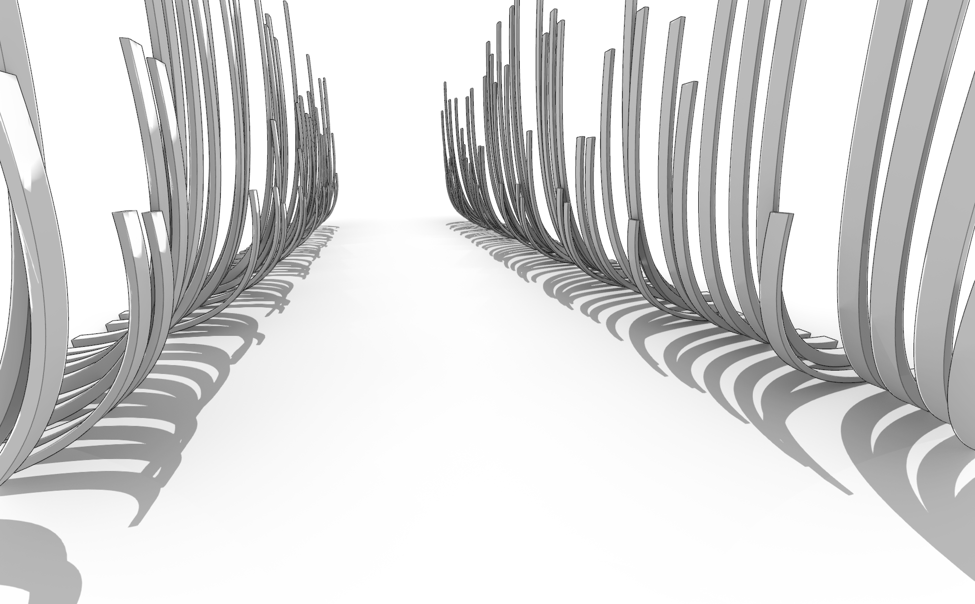 render it to be a threshold to a building but make sure the shadow stays the same make the building behind the threshold add people in it as well do not change the model keep the beams the same make sure its flat not going up understand that this is a perspective and it looks like it is going up but it is actually on the same level make the building behind it more of a glass wall building with greenery make it four stories and make it a skyscraper