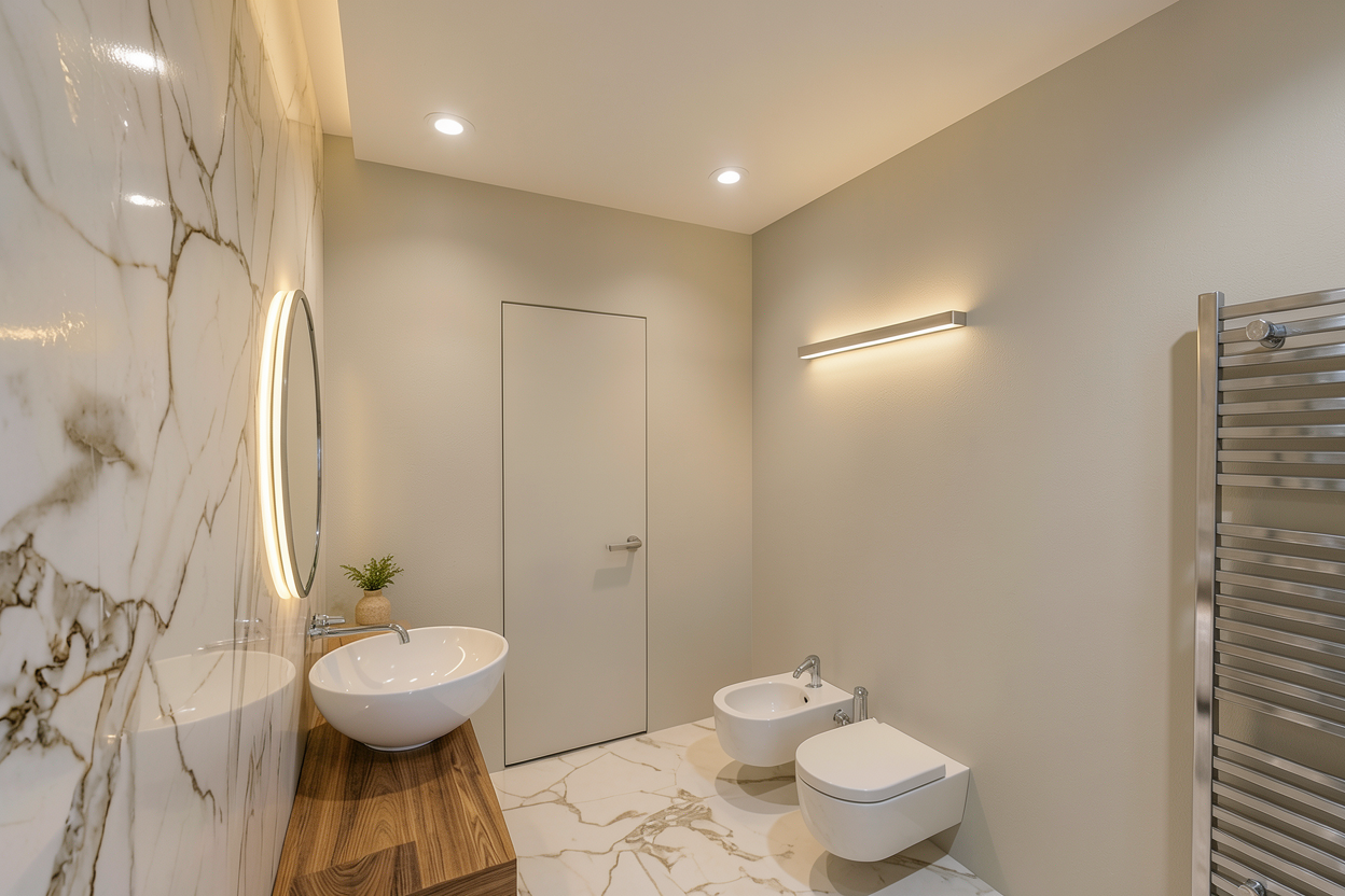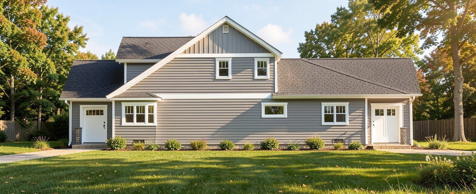 add trees make realistic house weather sunset with with cloudy night preserve color on frames of windows in light grey garage door as well light grey preserve all materials in same colors as origin picture in interior is used dark wood furniture add bike infront of garage door pavement around house use a dark concrete color in bricks add more trees and greenery on the sides of house dont use lights on facade