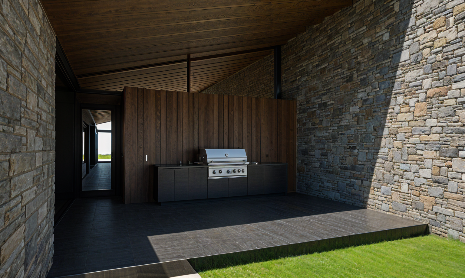 modernist exterior shot render during sunset with a basketball court and grey beige concrete walls architecture