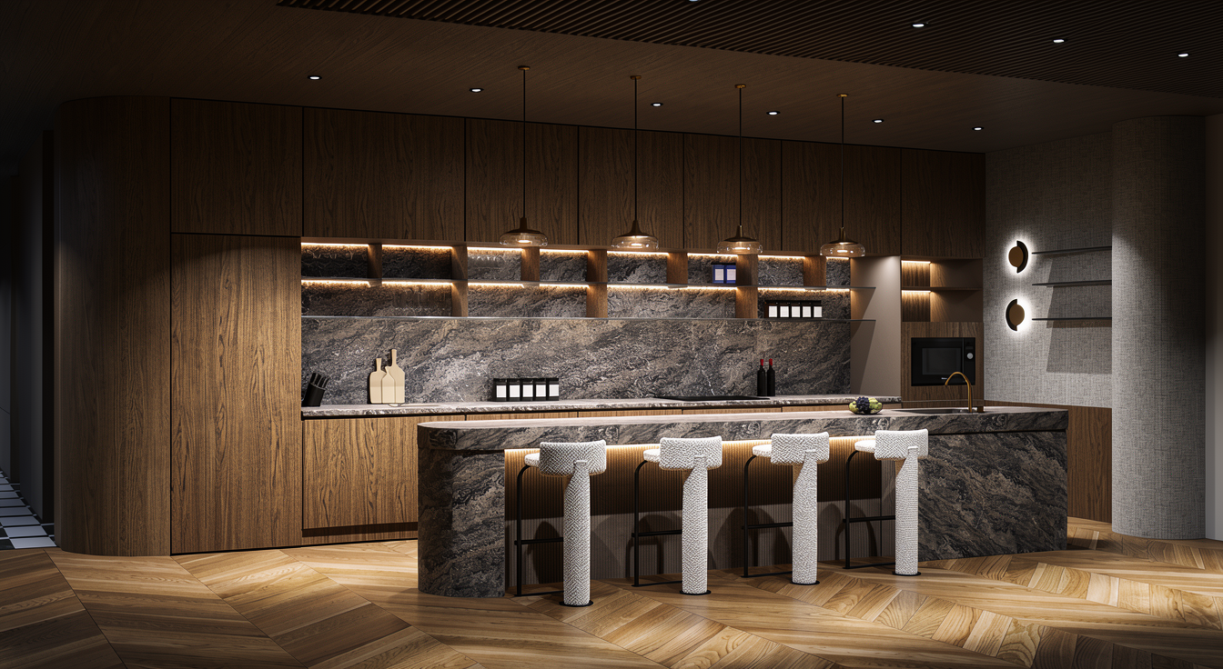 improve materials texture make it realistic but keep colors tones and patterns the same add realistic fabric texture to white stools with realistic scale make the image photorealistic high resolution keep all elements and colors the same night time environment keep same lighting keep same camera distance avoid zoom in keep same camera angle calm ambient luxury feel maintain same wooden color as reference image